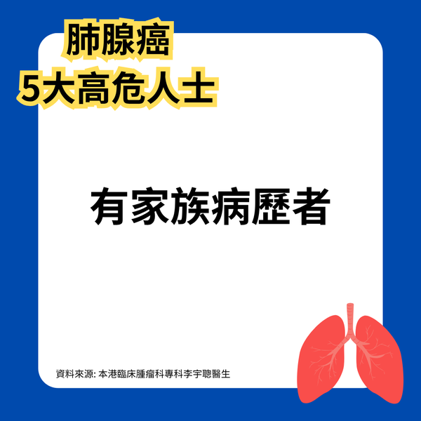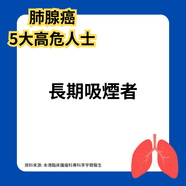 本港臨床腫瘤科專科李宇聰醫生過去接受TOPick訪問時表示肺腺癌屬於肺癌一種,9成以上的肺癌患者都在50歲以上,並拆解5大高危人士: