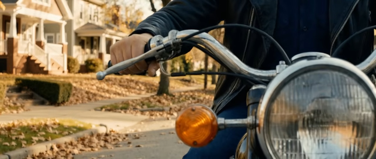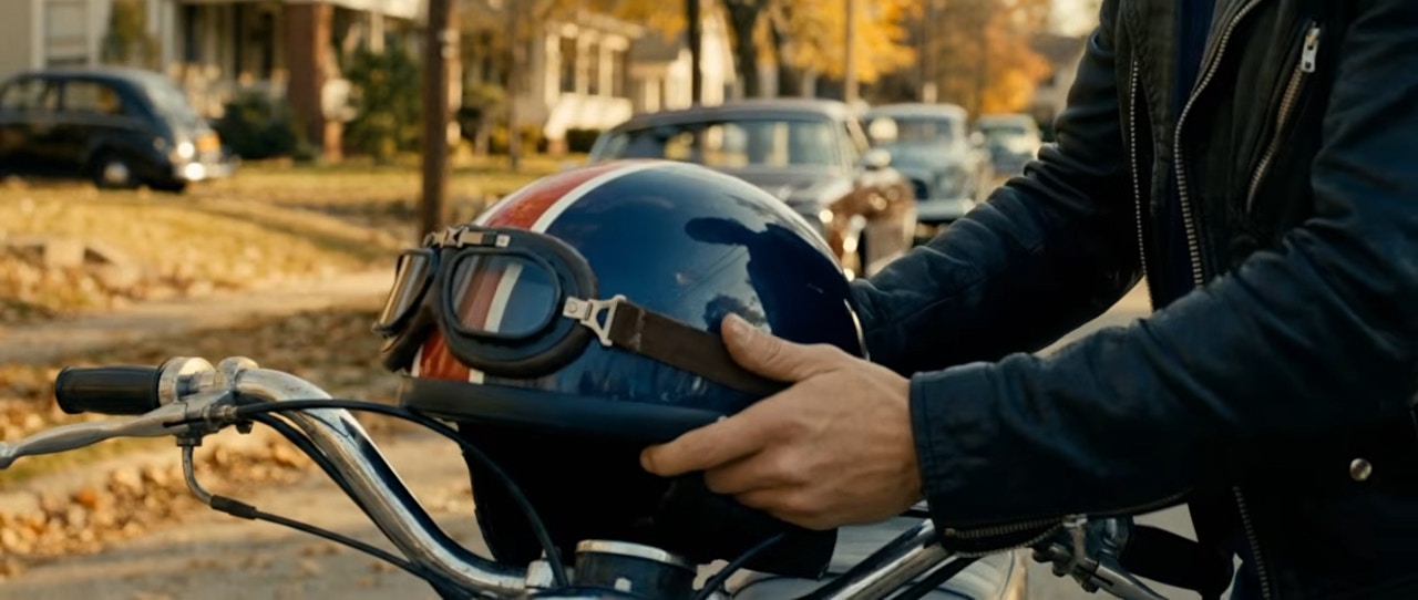 基斯伊雲斯飾演的Steve Rogers駕駛電單車返回《復仇者聯盟4》與卡特探員跳舞的居所之中。(網上影片截圖)
