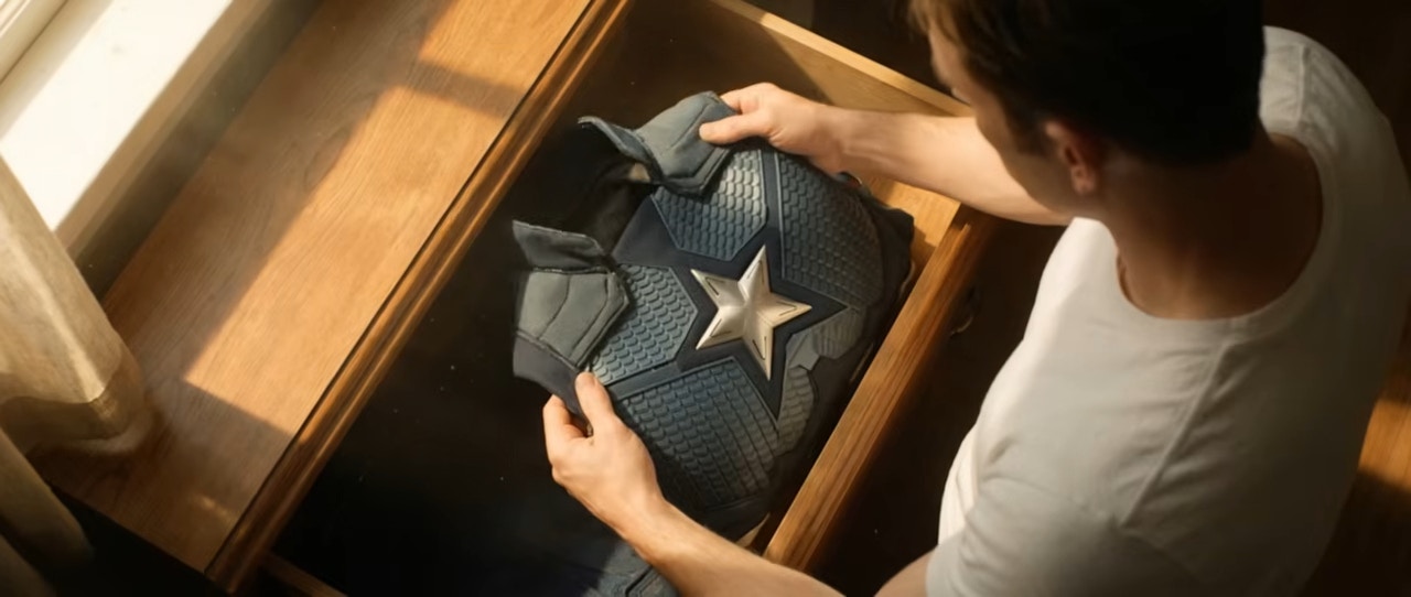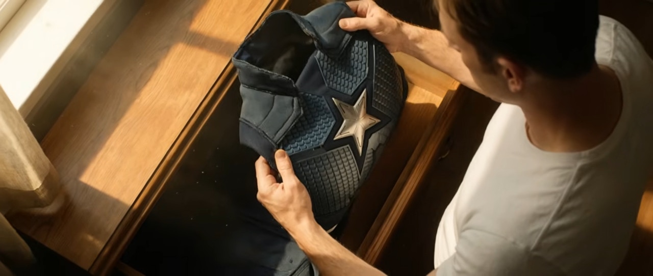 Steve Rogers在《復仇者聯盟》主題曲下拉開櫃桶取出美國隊長制服緬懷過去。(網上影片截圖)