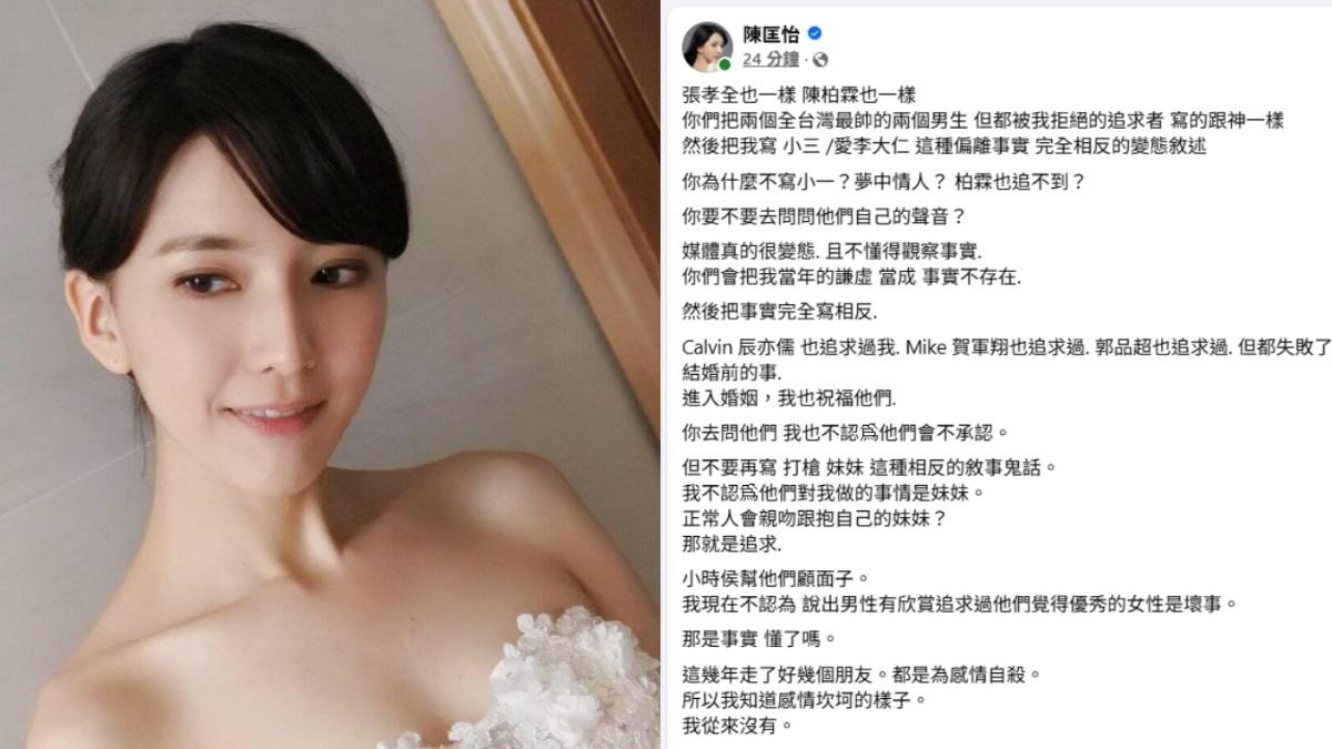 陳匡怡表示,自己曾被多位藝人追求,但媒體卻將她描繪成「小三」及「愛李大仁」,與事實完全相反。她強調,過去被張孝全、陳柏霖、辰亦儒、賀軍翔、郭品超等人追 ...