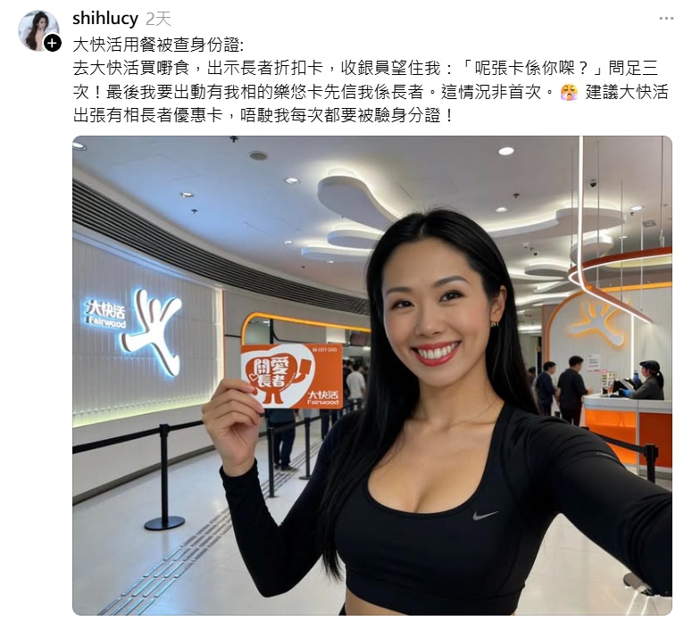施熙瑜對自己的「逆齡」外貌似乎非常有信心,她早前在Threads發文中自爆生活趣事,指自己在使用長者優惠時,經常被質疑其身分,甚至要求她出示身分證證明已達長者年齡。她此言一出,暗指自己真人與AI相片一樣年輕,無懼歲月痕跡。