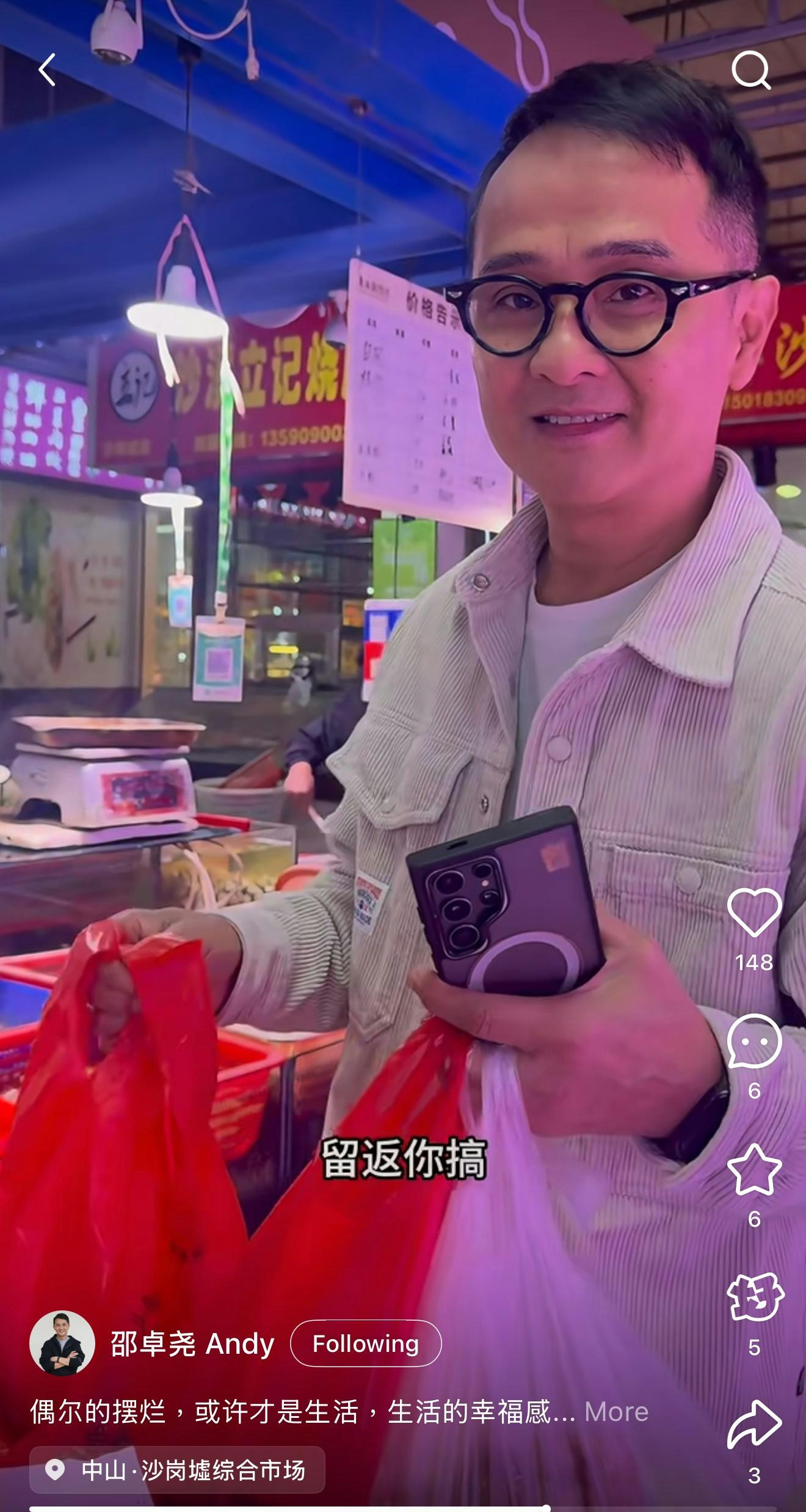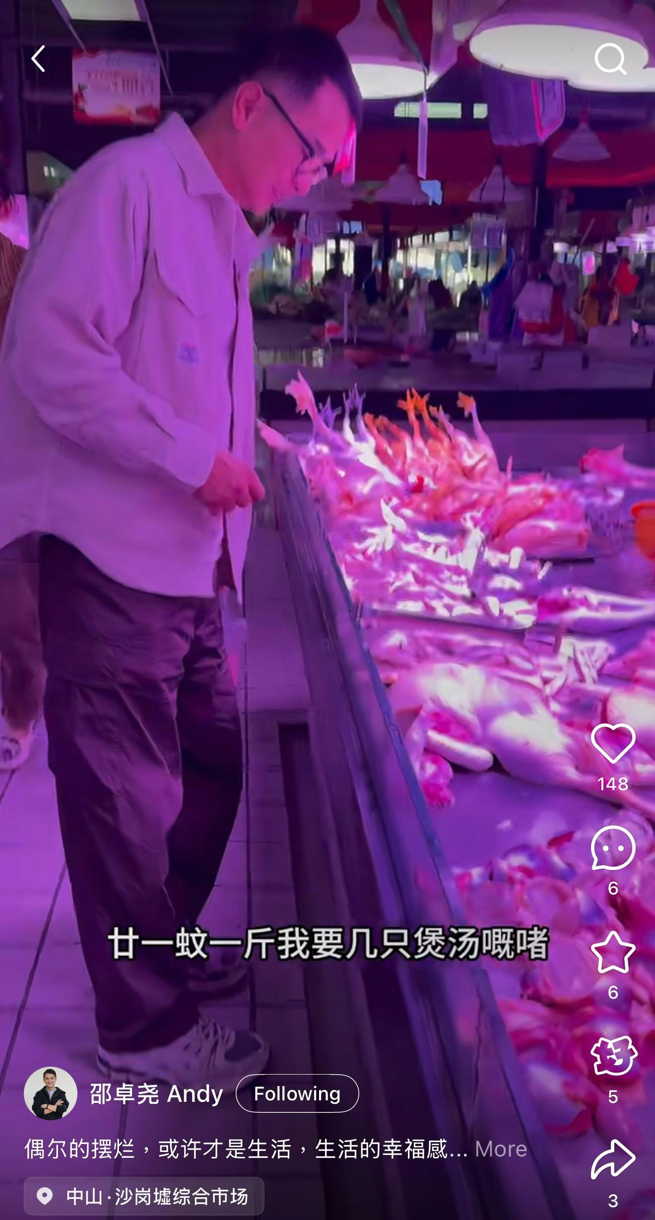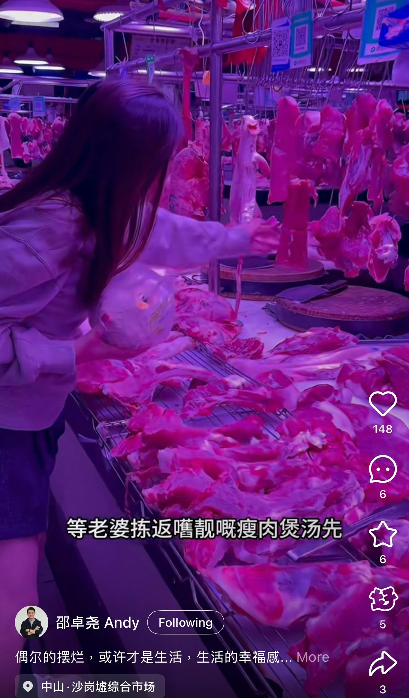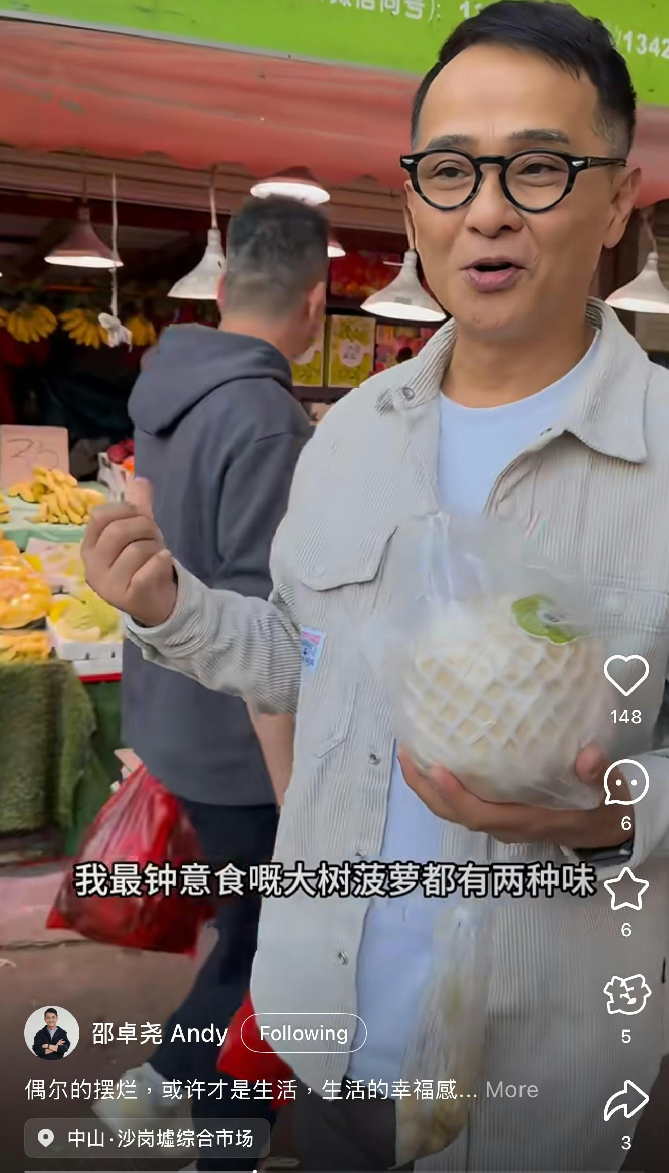 邵卓堯近日上載短片,他與太太到中山街市買餸,一派輕鬆。邵卓堯買完生果又買雞,買蔗時更明言今年要「掂過碌蔗」。邵卓堯買雞腳時間即場計數,五隻雞腳九個半,「新鮮嘢差唔多兩蚊一隻」,十分抵食。邵卓堯又曝光索妻背影,與太太行街市,相當恩愛。邵卓堯直言:「偶爾的擺爛,或許才是生活,生活的幸福感,不在於富足,而在於滿足。買餸煲湯與老婆的二人世界。」並指行街市好治癒。