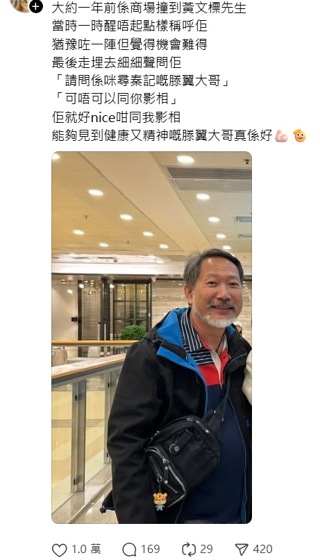 雖然黃文標已年屆63,鬍鬚和頭髮都變成了銀白色,但精神飽滿,面色紅潤。該網民上前相認,問道:「請問係咪《尋秦記》嘅滕翼大哥?」黃文標不但冇拒絕,更非常有禮貌地答應合照,獲讚Nice到爆!相中可見,黃文標身穿便服,笑容慈祥,完全沒有昔日劇中「惡人」的戾氣,反而多了一份慈祥大叔的親切感。