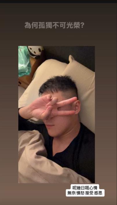他還上載一張在床上掩面獨照,神情落莫明顯心情不佳,以