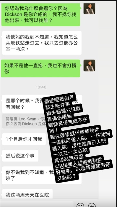 不過,關曜儁日前在IG Story上載了一張對話截圖,自爆遇上騙徒,被呃6位數!他未有披露被騙的來龍去脈,但從截圖中可見,他正心急如焚地尋找一名叫「Dickson」的人士,而與他對話的正是將Dickson介紹給他的中間人。對話內容顯示,該名中間人不斷以各種藉口推搪,令關曜儁忍無可忍爆Seed!