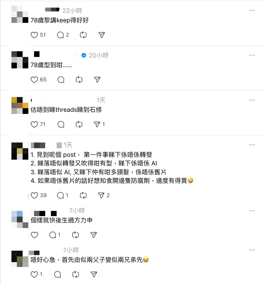 以往修哥都被指與方力申相似度極高,甚至似樣過修哥跟親生仔陳宇琛,不少網民留言:「以為係方力申!」、「由似兩父子變似兩兄弟先」由於石修看起來實在太後生,有人留言質疑:「睇下係唔係AI」、「係咪舊片嚟?」亦有網民自嘲:「然後我40都未到,行步路都氣喘,佢仲有氣吹Saxophone」、「石修究竟食咩大?」此外,不少網民重提2004年石修在無綫《隔世追兇》中,於叢林內靠催眠匪徒成功脫險的經典場口,劇中對白為:「我當時好危險,生命受威脅,於是我停落嚟,我望住佢,我咁同佢講……你流緊血喎,你睇地下,一滴、兩滴、三滴……就係咁,催眠咗佢喇。」網民也在留言欄不段洗版「一滴、兩滴、三滴……」亦有人搞笑謂:「石修吹Sheksauphone 真係好好聽👍👍👍」