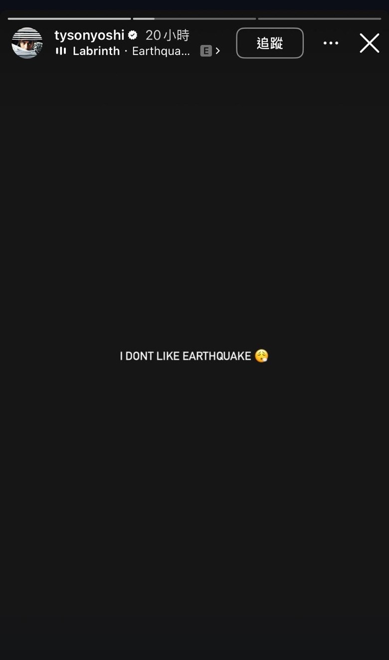 歌手Tyson Yoshi亦在台北感受到大地震。(ig圖片)