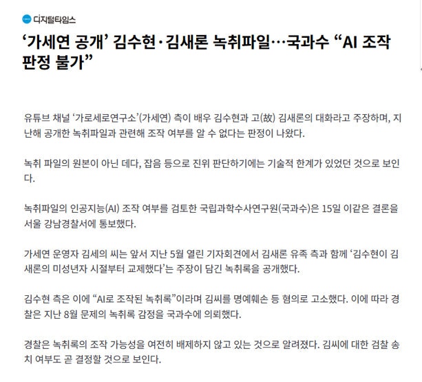 據韓媒報道,國科搜向警方通報的鑒定結果顯示,技術層面上「無法判定」錄音是否經過AI篡改。報告指出,主要原因是送檢的樣本並非「原始錄音文件」,而是警方從記者會現場轉錄的播放版本,檔案中含有大量背景噪音,導致現有技術難以辨識是否存在AI合成痕跡。