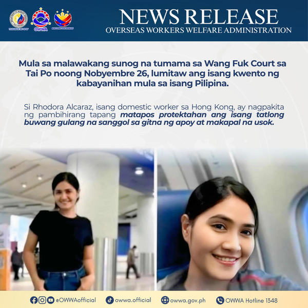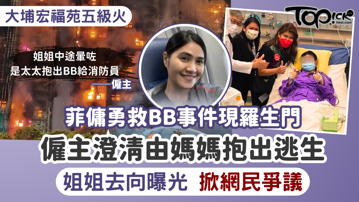 【大埔宏福苑五級火/外傭】宏福苑早前發生五級大火,多戶居民一夜間失去家園。其中,28歲外傭Rhodora Alcaraz來港僅數天便遇上火警。有報道指她以身護主,緊抱年僅3個月大的嬰兒逃生,最終戶主太太與BB獲救。不過,戶主近日公開逃生過程,澄清BB並非由外傭救出,「外傭護少主」一事出現羅生門。