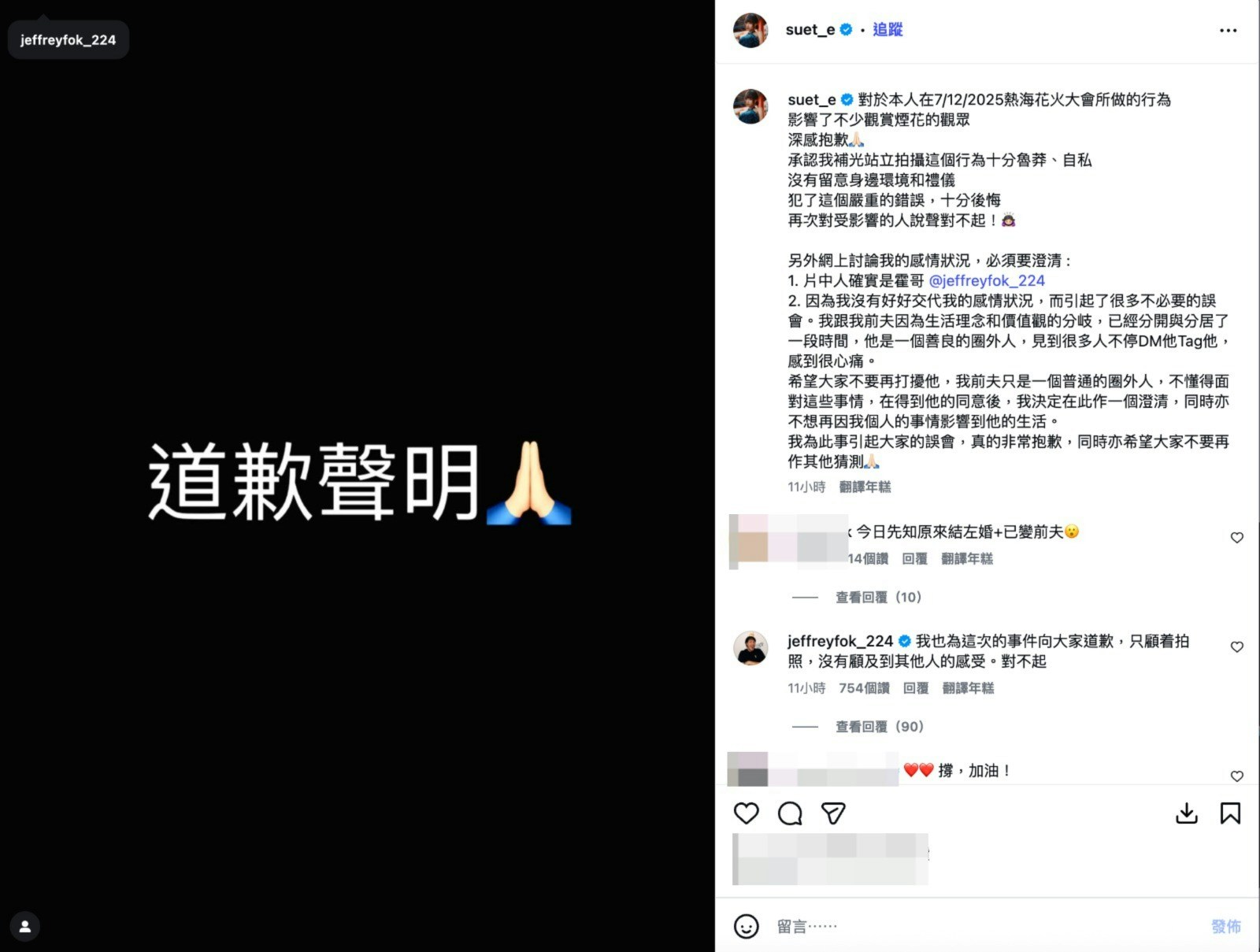 雪兒在IG發道歉聲明,寫道:「對於本人在7/12/2025熱海花火大會所做的行為 影響了不少觀賞煙花的觀眾 深感抱歉🙏🏻 承認我補光站立拍攝這個行為十分魯莽、自私 沒有留意身邊環境和禮儀 犯了這個嚴重的錯誤,十分後悔 再次對受影響的人說聲對不起!🙇🏻♀️」