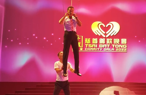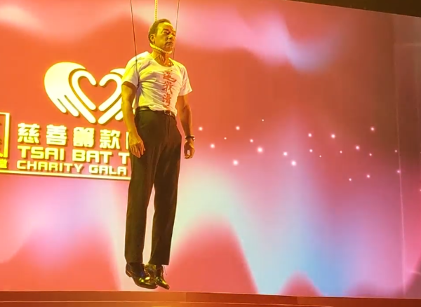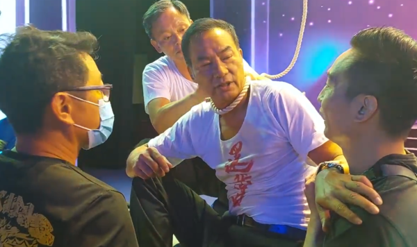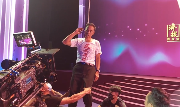 初時雙腳懸空的華哥,一時間未能掌握到繩子索頸的力度,說時遲、那時快的失去平衡,被繩索纏頸臉露痛楚,嚇得導演叫大家把華哥放下來,著地剎那華哥仍有餘悸的說:「剛才真的有兩秒缺氧險窒息的感覺!」