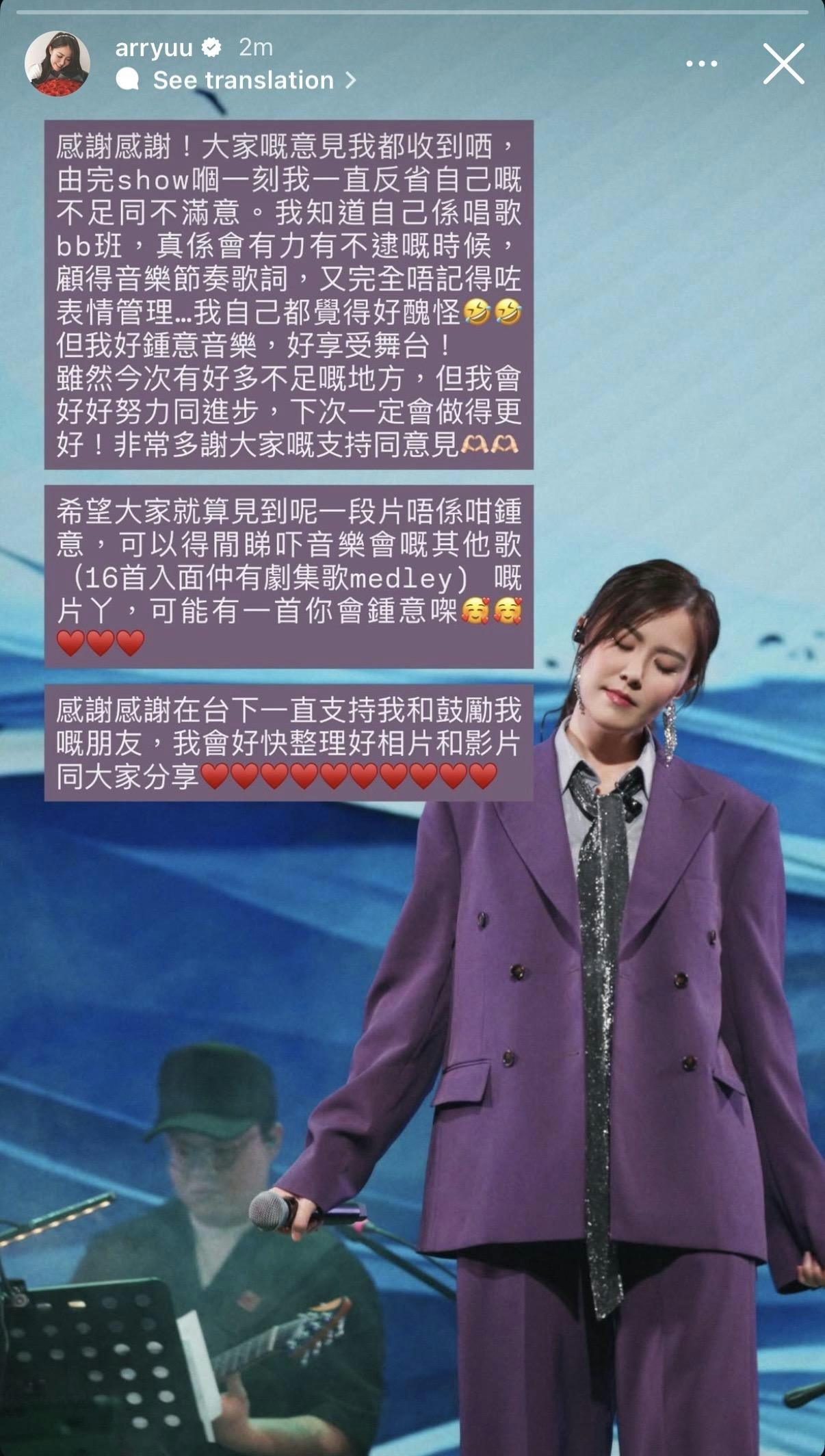 她指自己今次確有不足,但會好好努力和進步,承諾下次會做得更好,也感謝大家的意見。她續說:「希望大家就算見到呢一段片唔係咁鍾意,可以得閒睇吓音樂會嘅其他歌(16首入面仲有劇集歌medley〕嘅片丫,可能有一首你會鍾意㗎。🥰🥰♥️♥️♥️」