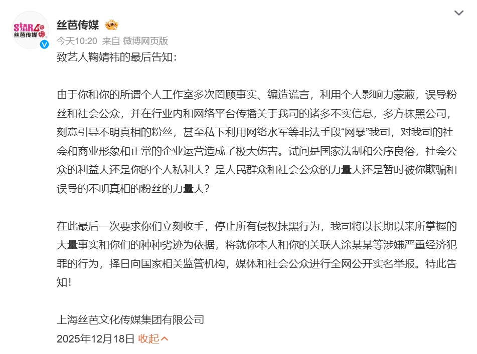 今日(18日)絲芭傳媒公開發表一份名為《致藝人鞠婧禕的最後告知》的聲明,言辭極為強硬,直接向鞠婧禕發出「最後通牒」,要求她立即停止所有侵權及抹黑行為。