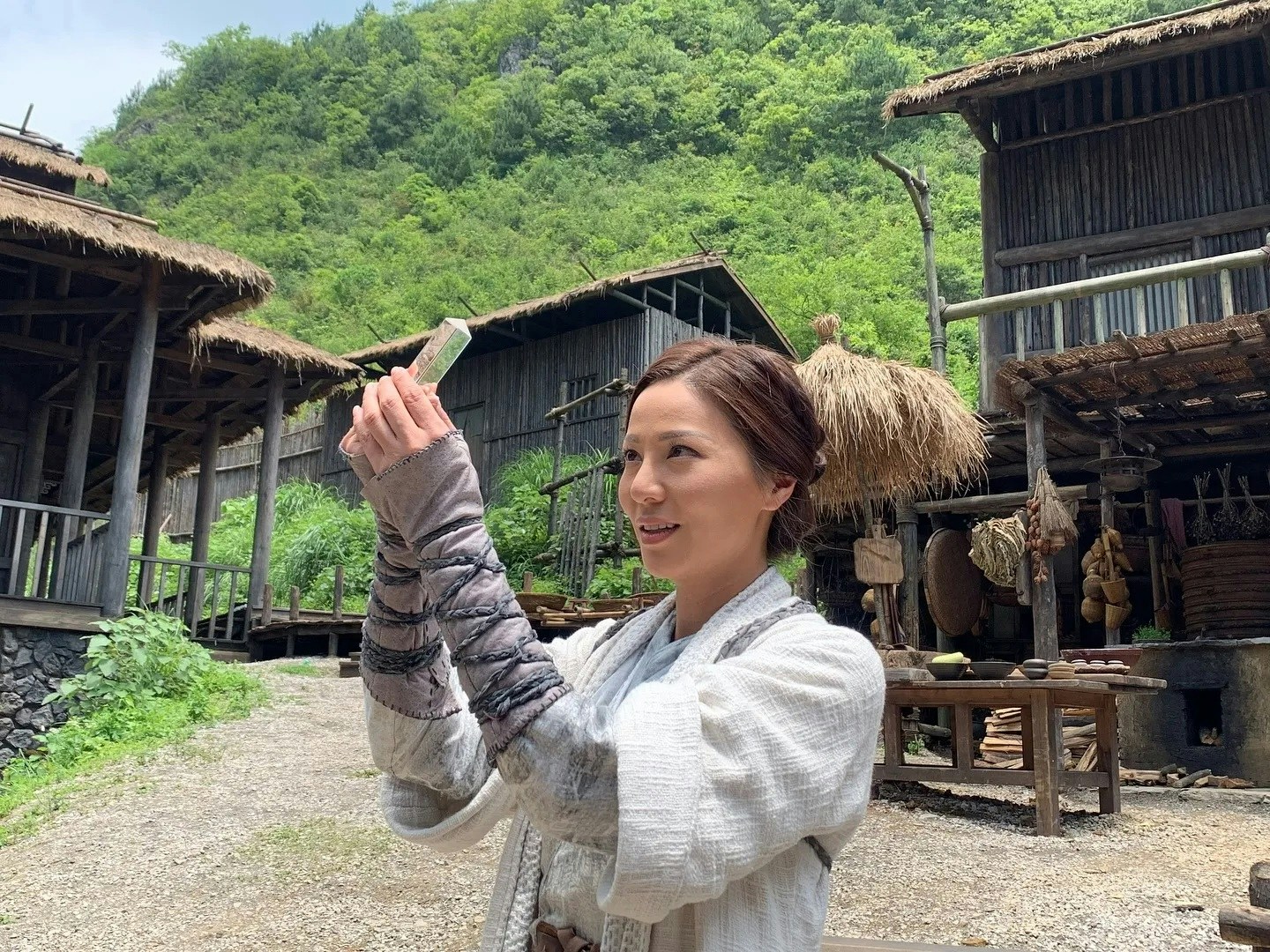 而另一張相,就見到滕麗明手執一塊水晶對着天空,面露笑容。如果有睇電視劇版,就知這顆水晶近乎是她跟項少龍(古天樂 飾)的訂情信物。當日善柔與項少龍相遇,項要求善柔帶自己到咸陽,善柔故意刁難,說要將天上彩虹拿下才肯帶路。結果項少龍用水晶折射的原理,將彩虹射到她手上,男方不以為意,但女方此刻已覺情投意合。而來到電影版,滕明名再次拎起這件信物,未知跟電影發展是否有莫大關係?跟項少龍又是否餘情未了?