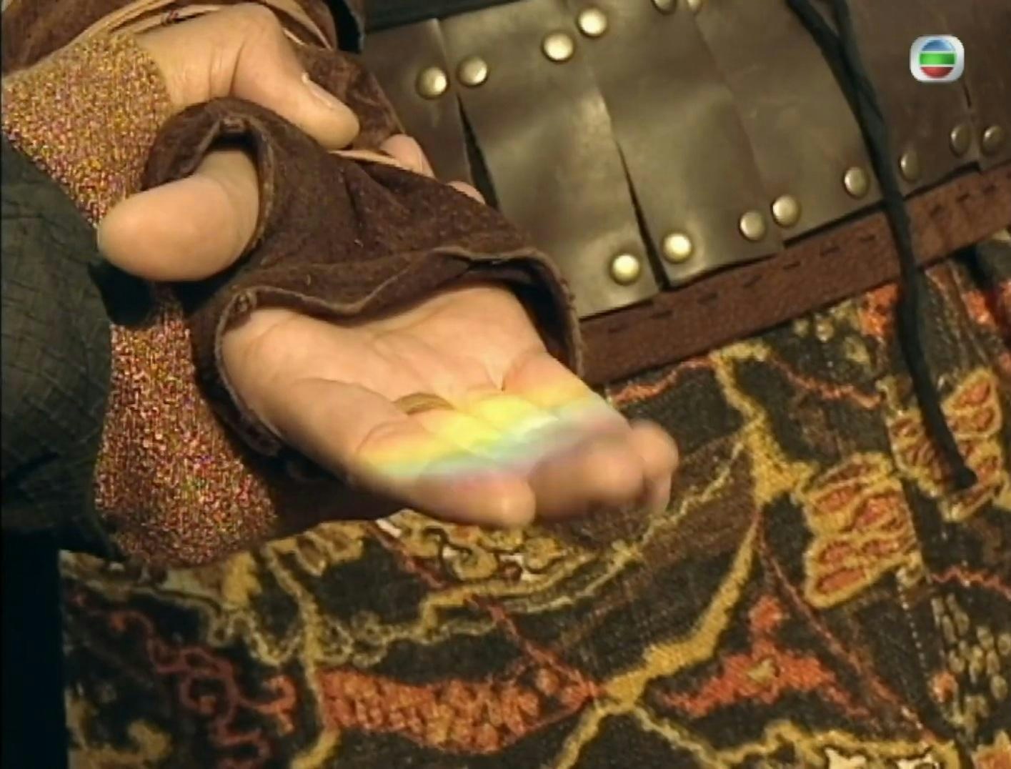 原來項少龍是用水晶折射的原理,將彩虹射到她手上。(《尋秦記》影片截圖)