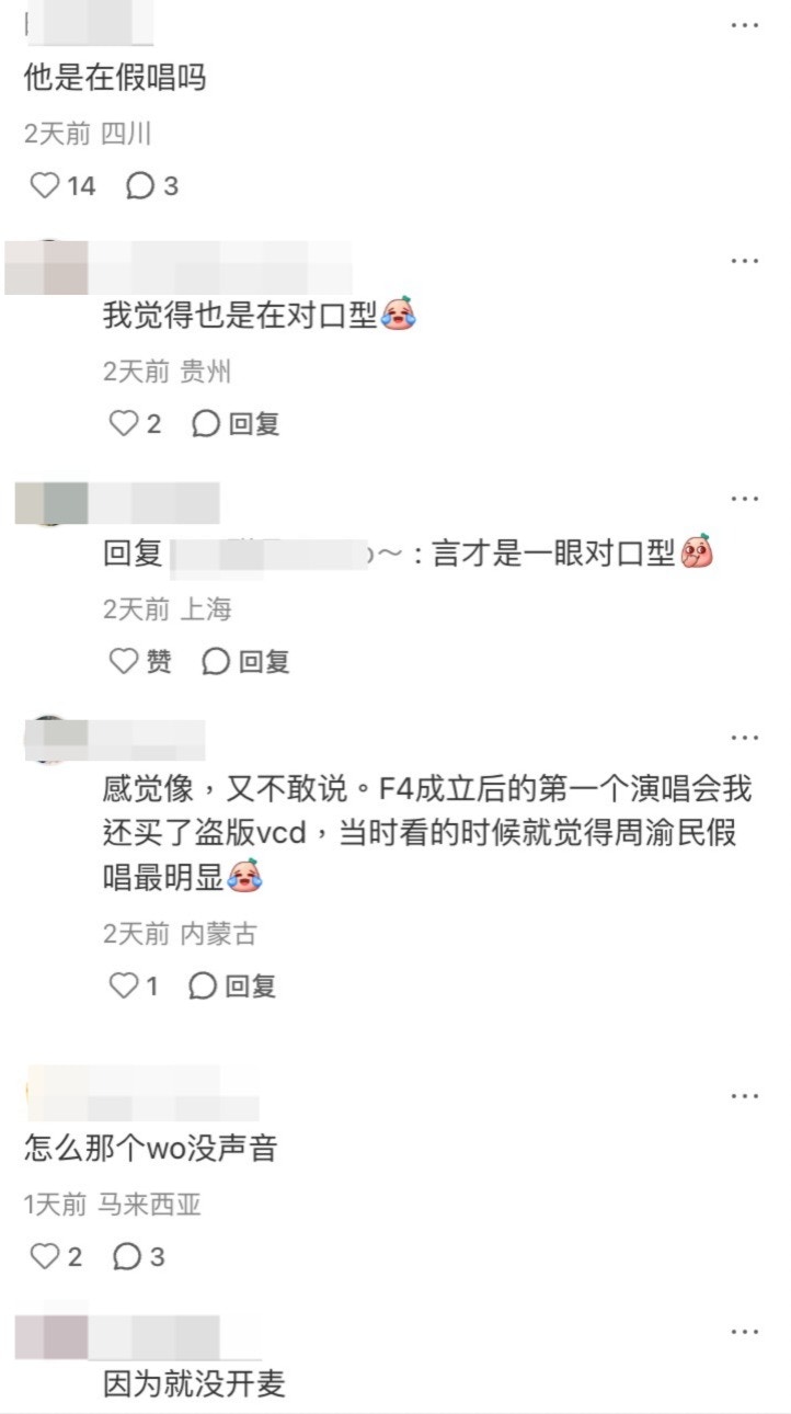 另外,有網民表示在現場看到周渝民唱歌,雖然他表情誇張,片段中亦看到他不斷唱出和音,但現場卻沒有聽到他在唱而惹來「咪嘴」之嫌:「他的咪有開嗎?」、「怎麽那個『WOW』沒聲音」、「一點聲音都沒有」、「他唱了嗎?」、「真的有在唱嗎?」、「假唱吧」、「一定是對口型」、「只有言承旭和霆鋒才配用“法拉利老了還是法拉利” 以前喜歡的類還是留在小時候吧 現在完全沒濾鏡」。
