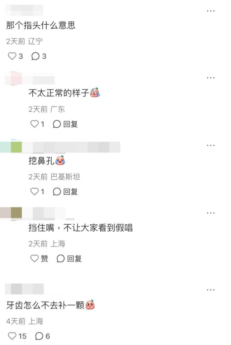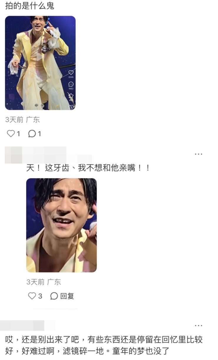 在網民分享到小紅書的片段,周渝民站在移動高台邊唱歌邊與粉絲作近距離接觸。不過片段中,周渝民誇張的表情及手指插鼻孔唱歌的畫面,竟遭網民截圖變成黑圖,更有網民表示看到周渝民走樣感到好心碎:「還是別出來了吧,有些東西還是停留在回憶里比較好,好難過啊,濾鏡碎一地。童年的夢也沒了」、「好油膩」、「以前得不到的男人,現在也不想要了」、「童年濾鏡碎一地,感覺跟自己老公一樣油膩,我不行了」、「仔仔老人味好強」、「他的牙為什麽如此黑?」、「為什麼手指要插鼻孔」。