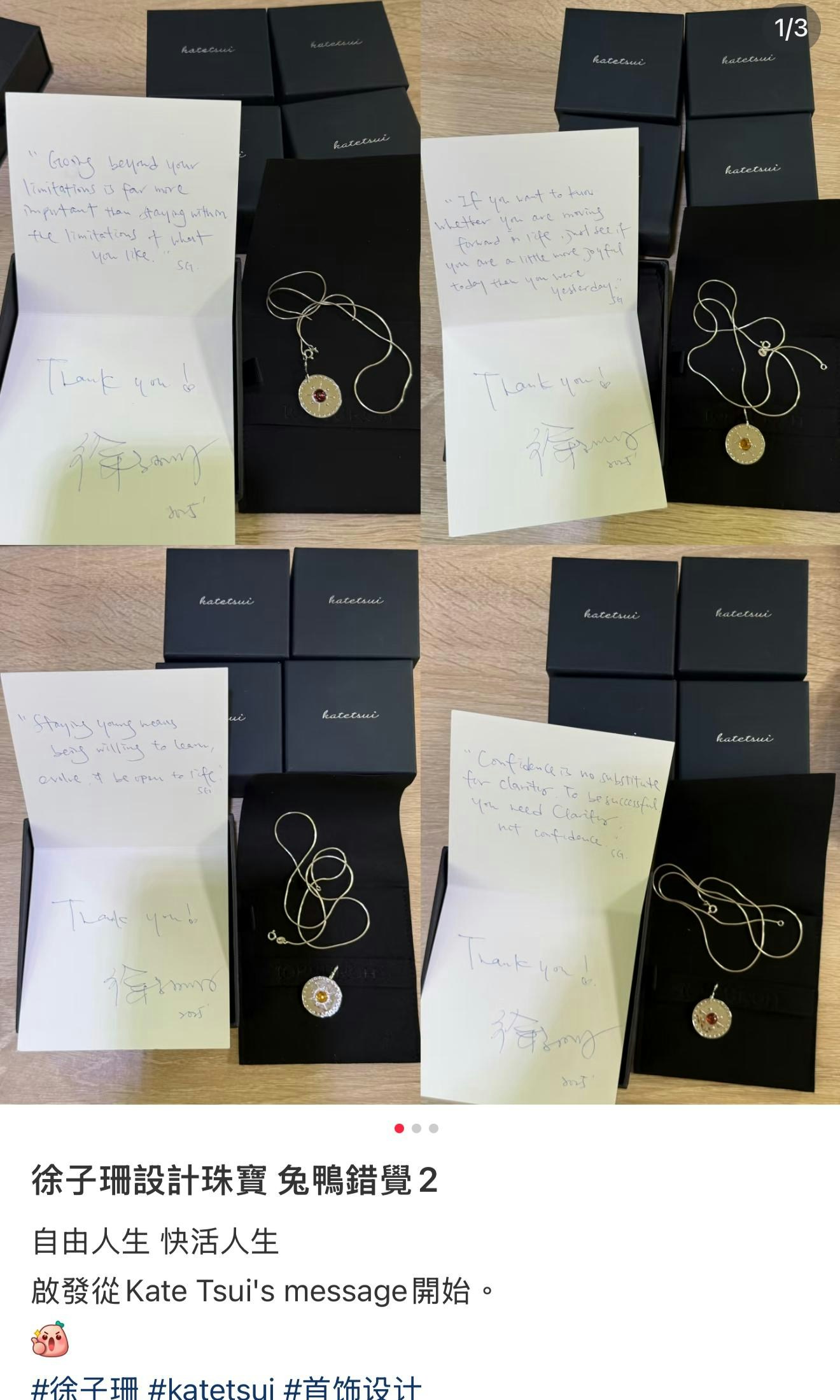 46歲前四料港姐冠軍徐子珊御任後加入TVB,多年來備受力捧,除了拍劇及唱歌外,更在電影《跟蹤》擔任女主角與梁家輝和任達華合作,更奪得金像獎「最佳新演員」獎。不過2019年宣布退出娛樂圈後,移居歐洲生活及進修。徐子珊出道早年,因在電台節目大談性事,被指有損港姐形象遭雪藏,梁思浩認為為什麼有些人又不用雪?(資料圖片) 第27屆香港電影金像獎「最佳新演員」獎由徐子珊奪得。(視覺中國)近日有網民上載徐子珊設計珠寶,並隨函附上親筆手寫信,令粉絲大感窩心。從相中可見,徐子珊在多張卡上寫了不同的鼓勵字句,首飾盒亦包裝精美,十分用心。曾被大台力捧的「當家五大花旦」之一徐子珊早已「升呢」為珠寶設計師和珠寶網店老闆娘,手握過百萬生意,她親自設計了好幾十款珠寶首飾,價錢由一萬至幾十萬不等,在網上出售,令她蛻變成名利雙收的知性強人。 徐子珊親撰手寫信極暖心!(小紅書) 徐子珊親撰手寫信極暖心!(小紅書)
