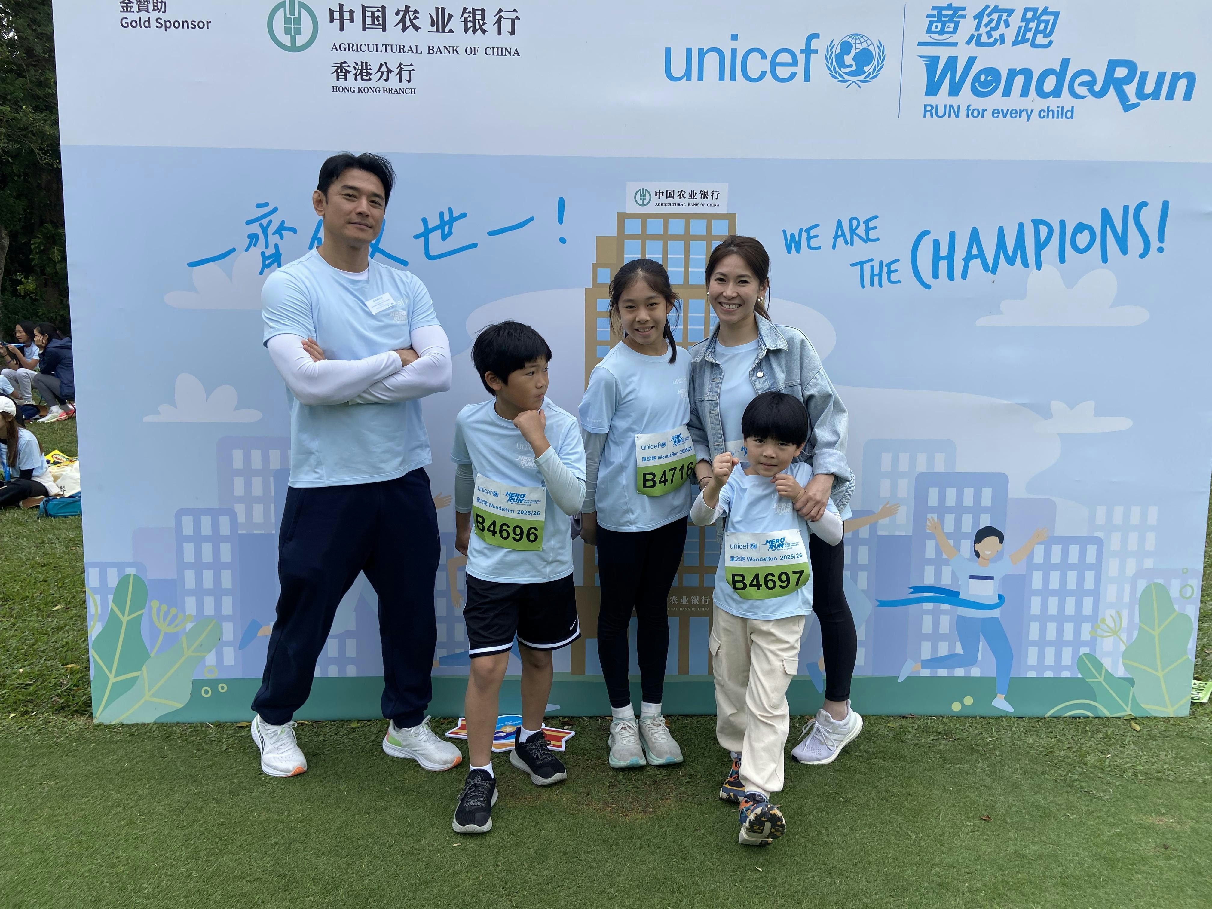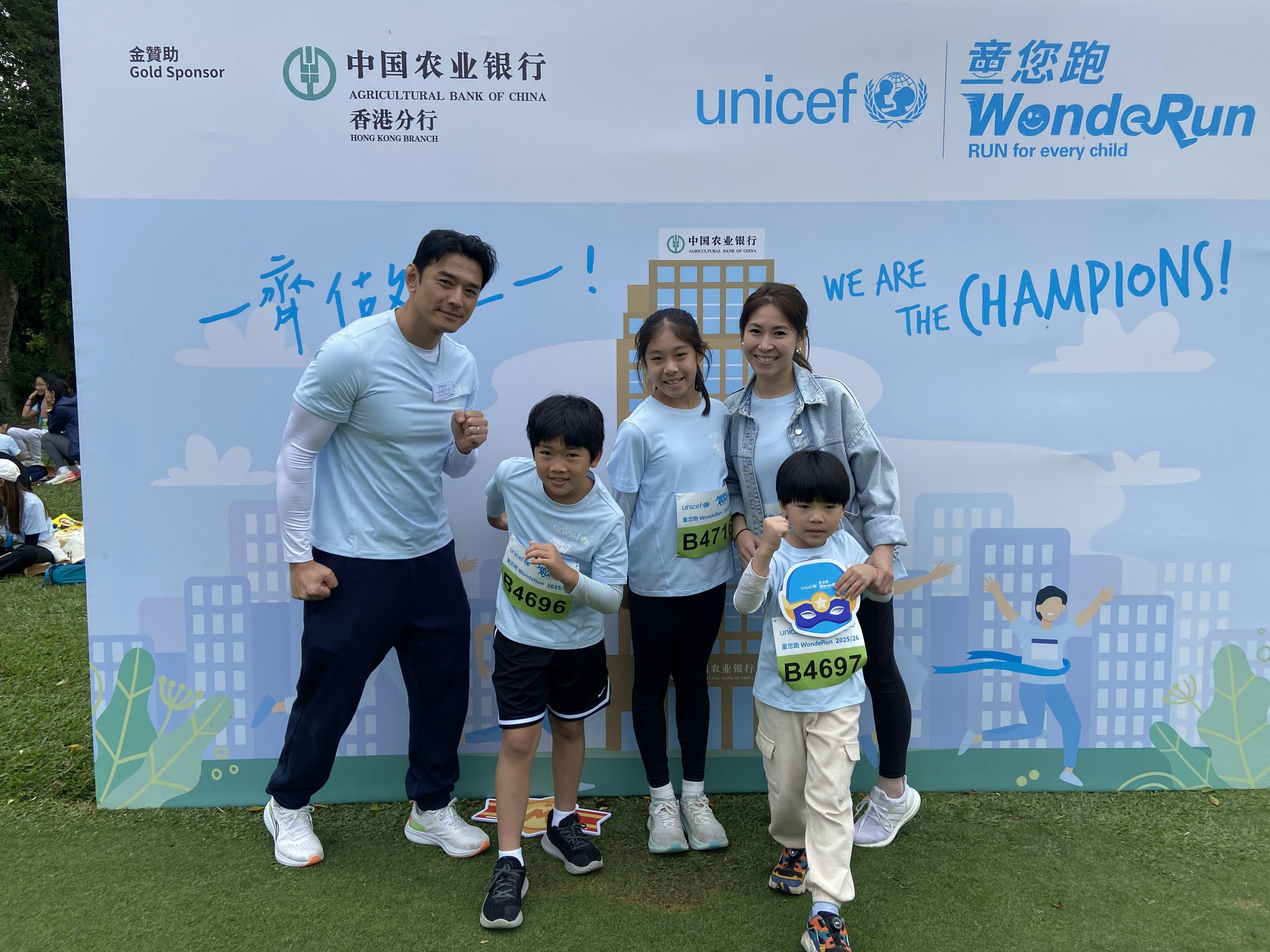黃長興(左起)與次子Tristan長女Paige、和孻仔Damien及太太Peggy一同出席慈善跑。(官方圖片)
