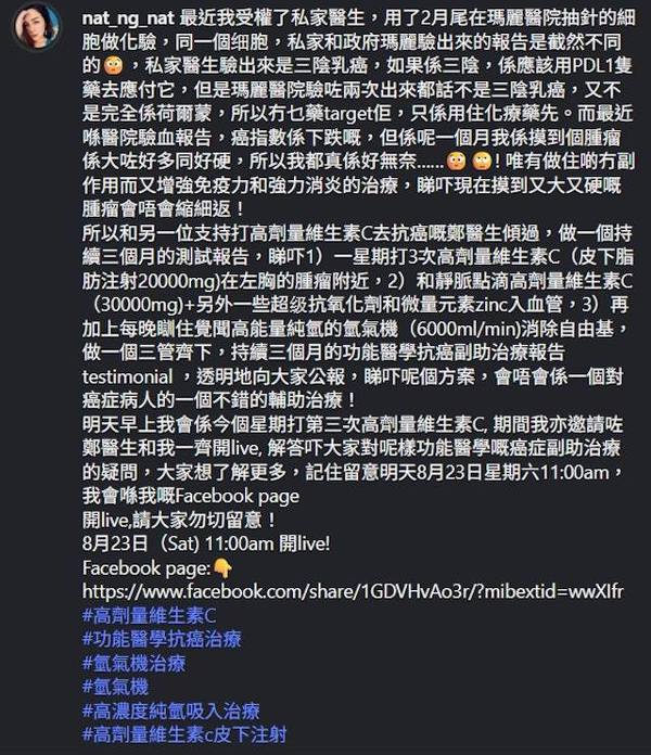 Natalie在節目中透露自己發現乳癌經過,源於三年前一次通淋巴,被按摩師按到胸部有硬塊,進行身體檢查後,確診罹患乳癌。最初她僅接受了部分腫瘤切除手術。然而癌症於去年復發,今年2月更因嚴重積水入院,情況危急,一度面臨「拔喉」的生死抉擇。在這個關鍵時刻,醫生的話點醒了她,她坦言: