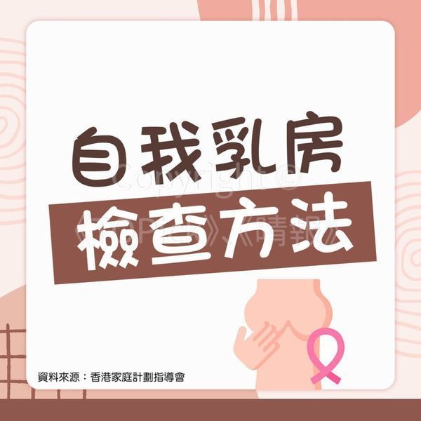 其實男女都會有可能患上乳癌,而兩者檢查乳癌的方法大致相同,只要定期檢查,可以增加及早發現乳癌的機會。據香港家庭計劃指導會資料,自我乳房檢查的目的是提高對自己乳房的認識及對乳房疾病的警覺性,大部分的乳房腫塊都是在自我檢查時發現。自我檢查應在乳房並無疼痛或腫脹的情況、如經期後進行;停經後的婦女則可在任何時候進行。任何女性一旦發現乳房腫塊,應盡早找醫生檢查,獲取專業的意見和診斷。