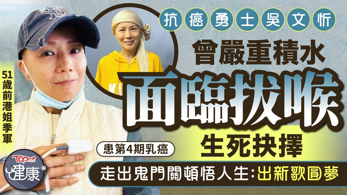吳文忻/乳癌丨現年51歲的前港姐季軍吳文忻(Natalie)自去年癌病復發後,儘管病情未見樂觀,但卻一直積極抗癌。她近日為電台節目《梨事會》作嘉賓時,便透露了今年2月因嚴重積水入院,一度面臨「拔喉」。不過,這段險死經歷,加上受到偶像鄭秀文的啟發,促使她決定出歌圓夢。