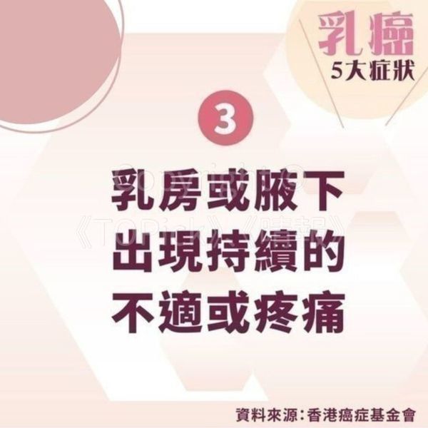 據香港癌症基金會網站資料,乳癌成因暫時成疑,但年齡增長、家族病史、高齡首次懷孕、沒有子女、不曾哺乳、更年期後肥胖、缺乏運動及酗酒等,均會增加患上乳癌的風險。以下為乳癌的5大症狀: