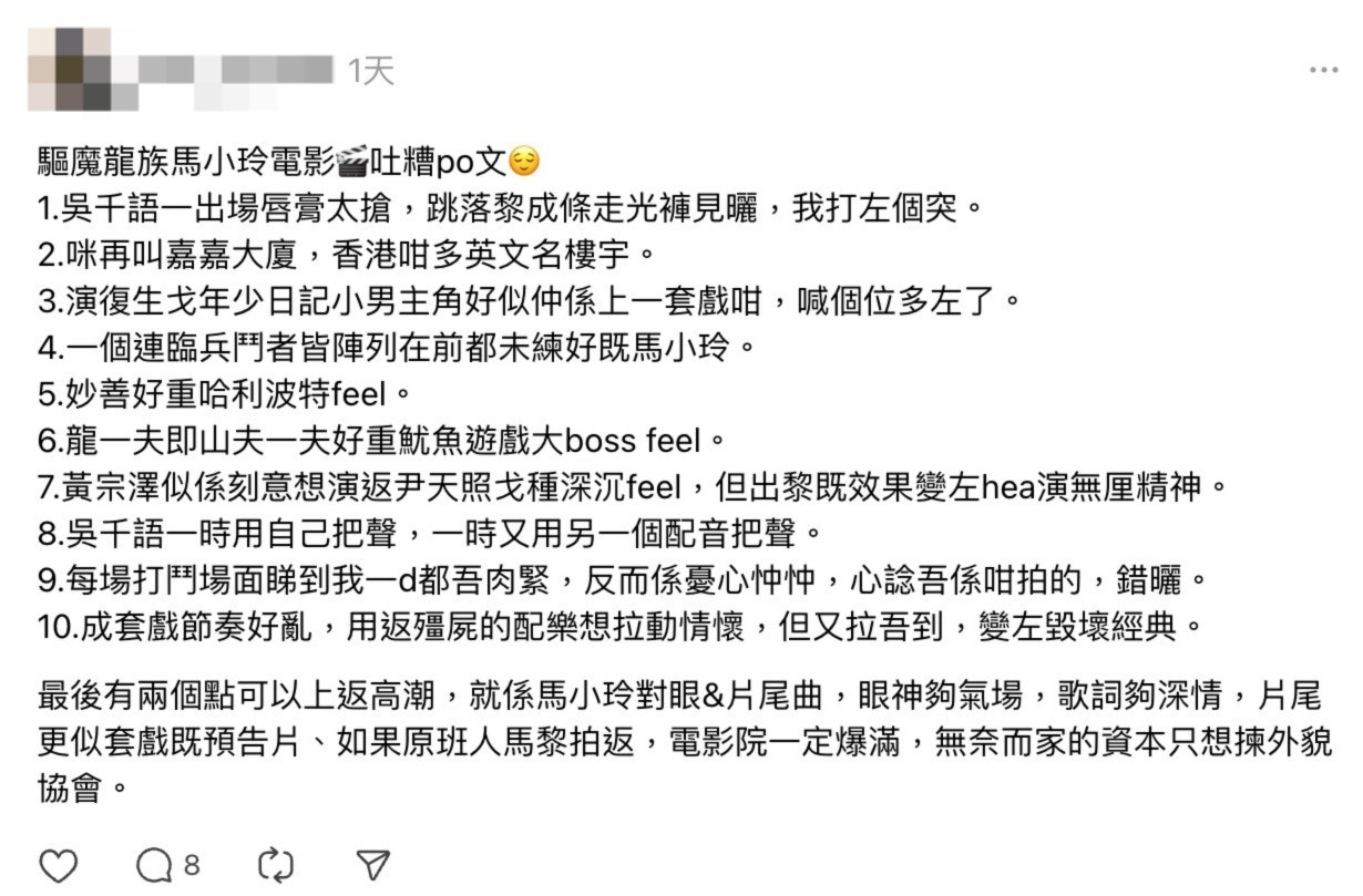 電影播出後,隨即掀起網民熱議,更惹來網民批評毀童年:「呢套嘢可以榮升爛片之首🤡」、「馬小玲都唔用萬綺雯已經死得」、「摧毀經典」、「未睇既就唔好浪費時間」、「近呢幾年嘅爛片之首」、「爛到咁呢我又好奇想睇下到底可以有幾爛」、「還我萬綺雯」、「冇萬綺雯睇嚟做咩」、「我的童年毀了」、「冇腳嘅馬小玲仲算唔算係馬小玲?」。