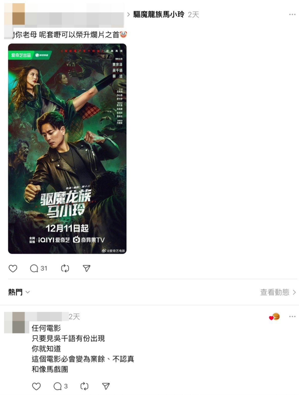 而今次飾演「馬小玲」的吳千語就成為網民圍攻對象,除了被指長腿不及萬綺雯吸引,更認為吳千語欠缺演技,演不出堅強兼外冷內熱的「馬小玲」:「吳千語唔只唔靚,係恐怖,角色動作明抄黑寡婦同妖夜尋狼......失望」、「任何電影 只要見吳千語有份出現 你就知道 這個電影必會變為業餘、不認真 和像馬戲團」、「想學萬綺雯嗰種高竇tone 出來變咗mk」。另外,有網民批評戲中所有都沒有人物刻畫,沒有深度:「劇情白開水,人物扁平化,演技特別可怕」、「成套嘢不如改名啦,當係第二套睇好過啦,睇完一肚氣,編劇導演還返個童年回憶畀我呀!」、「我覺得浪費咗我1個鐘29分鐘39秒!」。