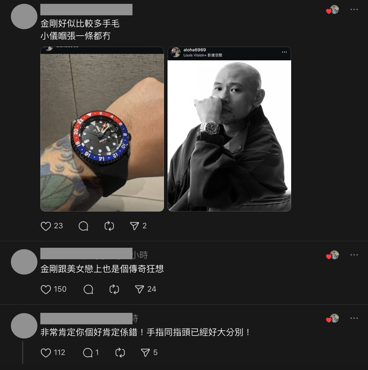 網民指金剛比較多毛,手指形狀也和相中的小儀丈夫的手不一樣。(Threads截圖)