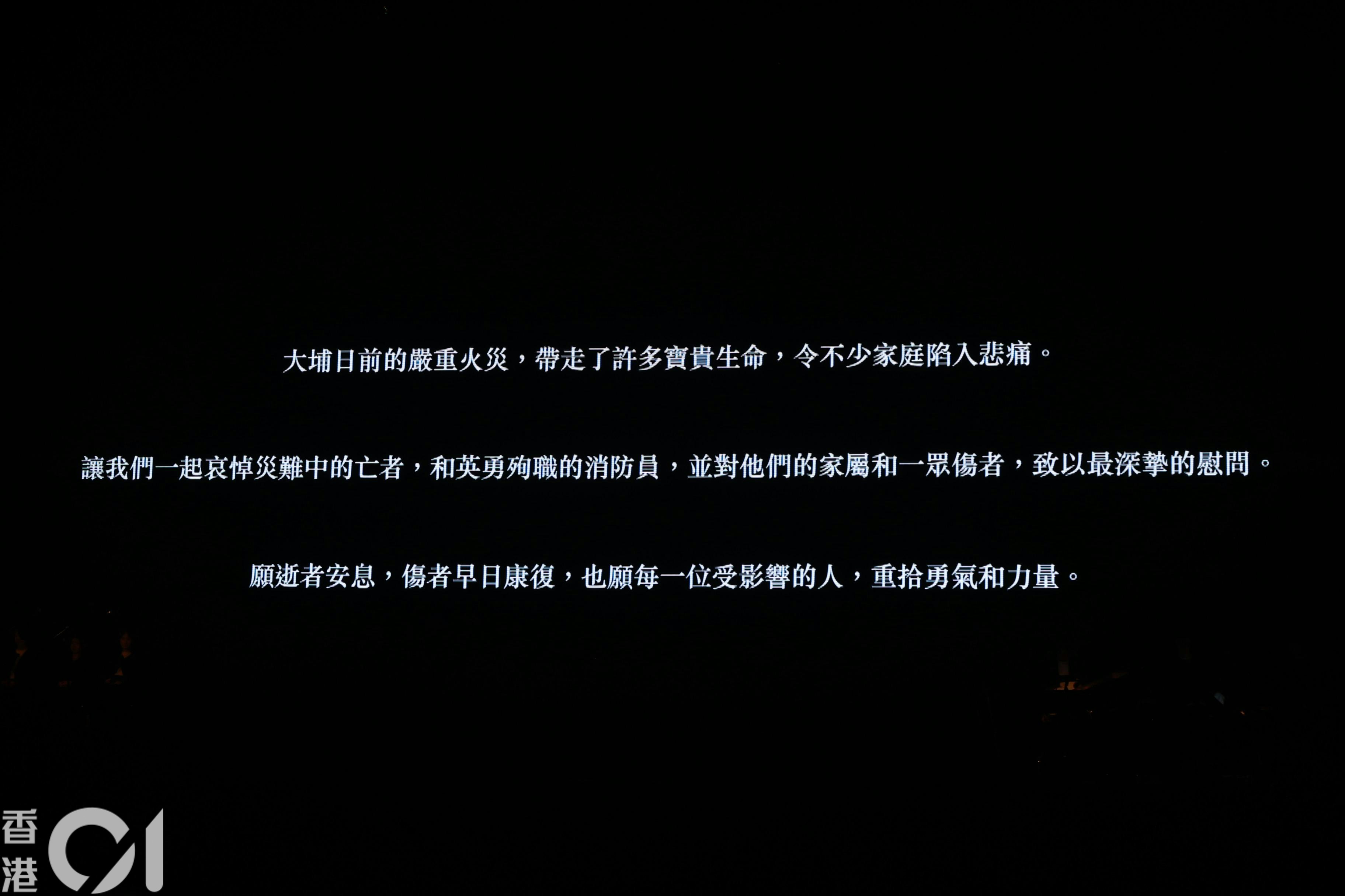 演唱會開始前,全場為大埔大火悲劇默哀一分鐘。(葉志明攝)