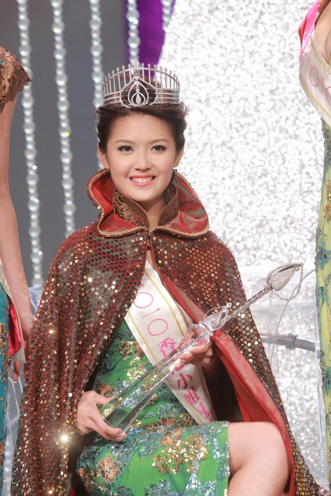 (左)2010年度的港姐亞軍張秀文、冠軍陳庭欣、季軍莊思明,以及「最上鏡小姐」李雪瑩。(VCG)