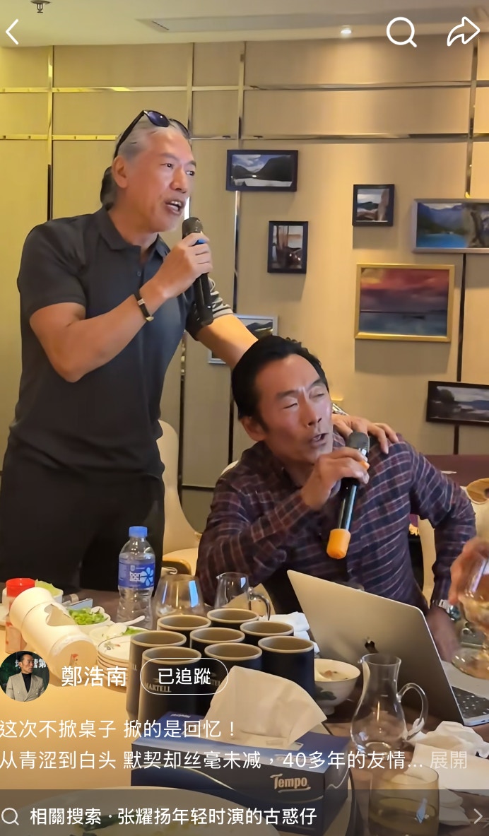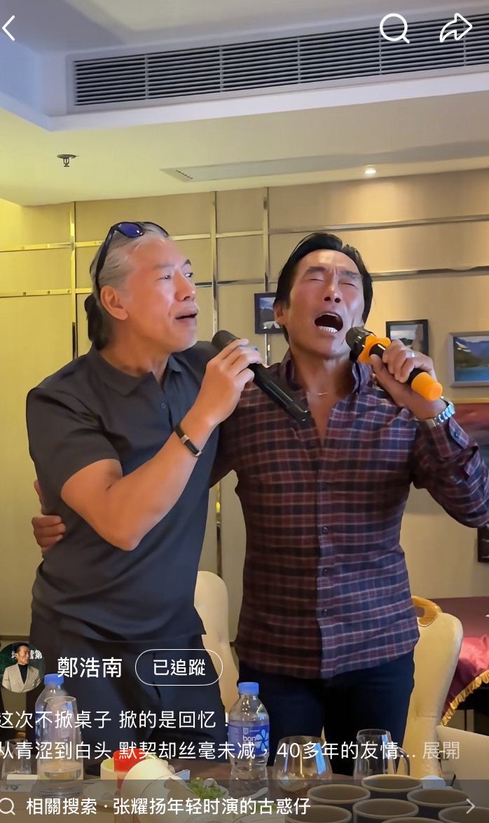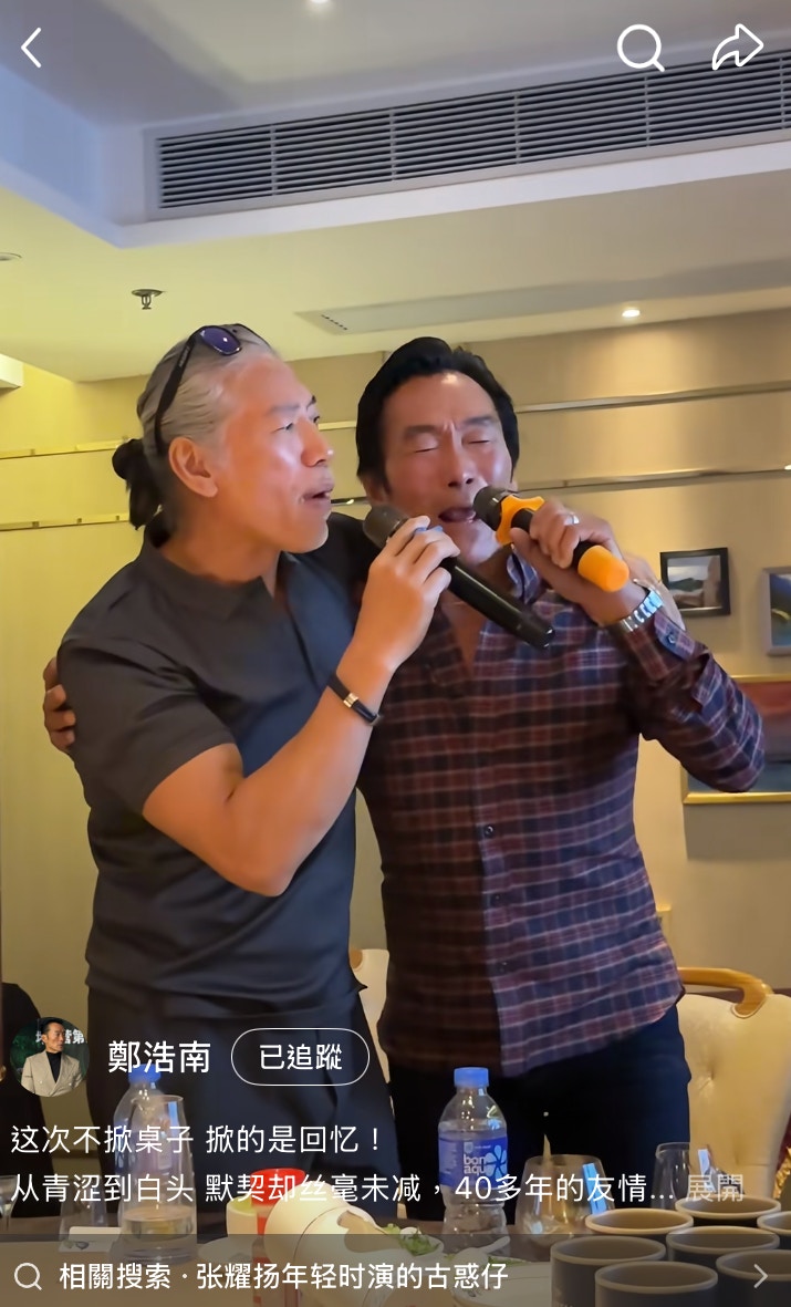 日前(12/12)鄭浩南在小紅書上更新近況,原來他約埋張耀揚飲宴,席間兩人高唱一曲《當年情》:「今日我,與你又試肩並肩,當年情,此刻是添上新鮮⋯⋯」短短幾句,就唱出了中年男人獨有的滄桑歲月感,似是唱出當年江湖上的事一般。帖文寫道的:「這次一掀桌子,掀的是回憶!」更引爆了留言區,內地網民紛紛表示:「帥叔叔,童年回憶」、「這倆反派太經典」、「樓下街巷兩班人馬蓄勢待發」,也有網民大讚兩人身型依舊,沒有走樣:「太棒了,狀態很好!」