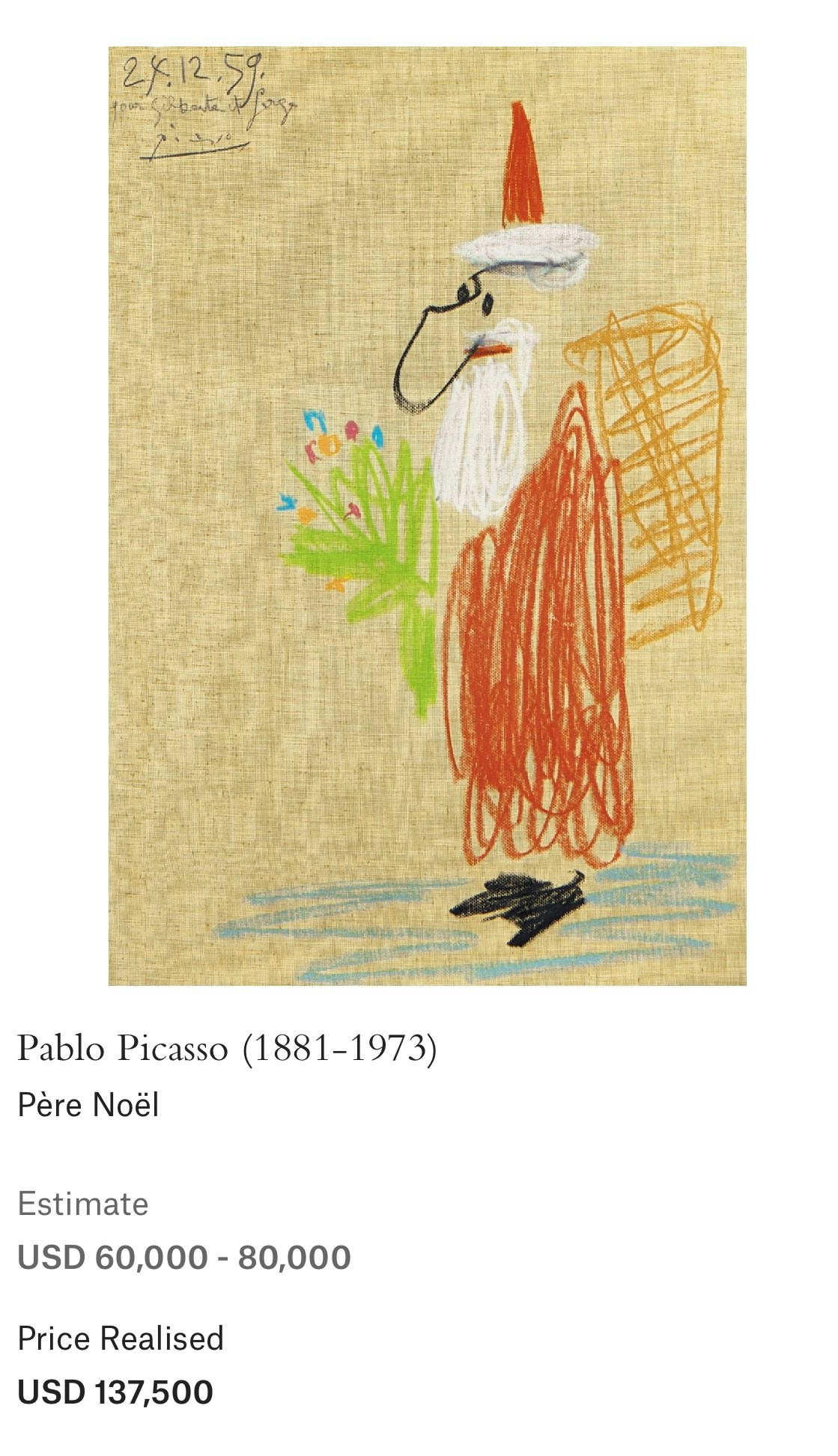原來這幅畫作的畫家,不是別人,正是著名畫家畢加索在1959年12月24日的親筆畫作《聖誕老公公》(Père Noël)。有人指出,這一幅畫作在2018年佳士以137,500美元(約108萬港幣)拍賣售出!一些資料也顯示,這幅作品最初是畢加索贈予好友Gilberte Duclaud及其丈夫Serge Chauby的節日賀禮,這也完美呼應了畢加索的名言:「我花了4年時間畫得像拉斐爾一樣,但用一生的時間,才能像孩子一樣的畫畫。」