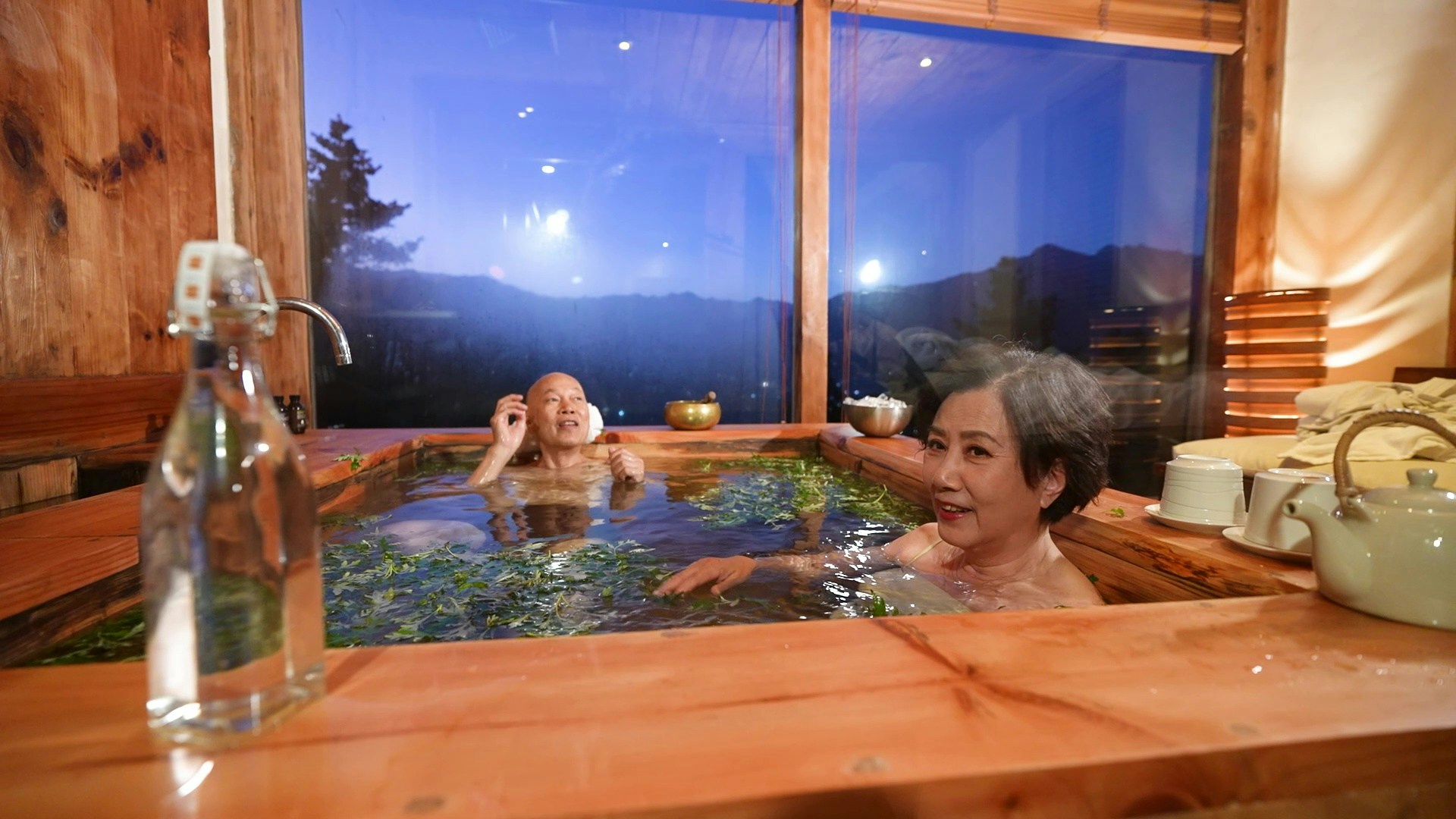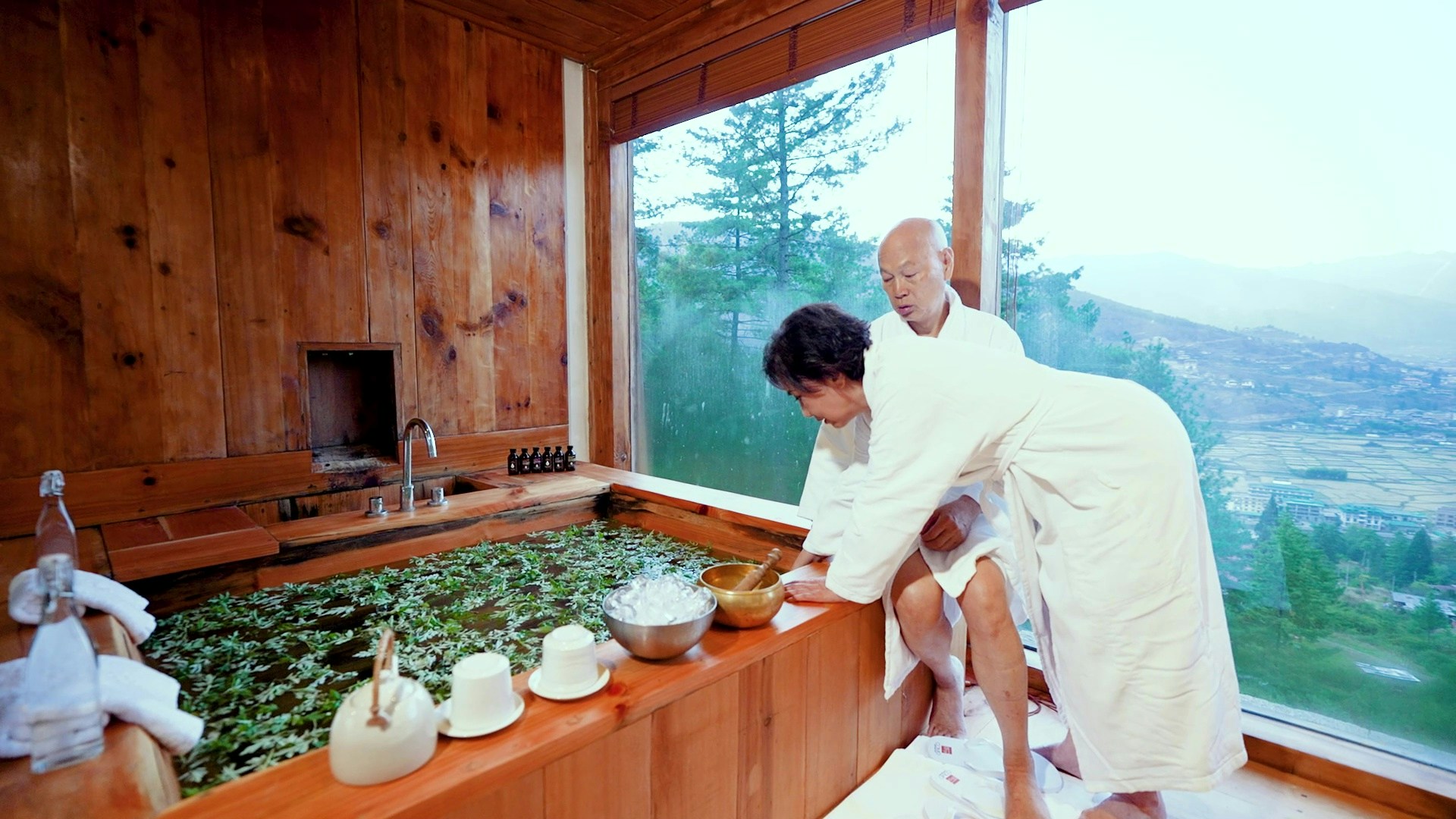 圍繞汪明荃(阿姐)出發看世界為主題的台慶綜藝節目《帶阿姐看世界》,將於今晚(13日)播出不丹篇最後一集。阿姐老公羅家英將花式示範「上山下水寵妻大法」,除安排直昇機Tour升上4,000米高空、方便畏高的阿姐可踏足不丹旅遊景點虎穴寺、親身見識藏傳佛教重要聖地,還帶阿姐到梁朝偉及劉嘉玲結婚的酒店歎熱石浴「鴛鴦浸浴」,在鏡頭前罕有地肉帛相見。向來擅長搞鬼搞馬的家英哥,浸浴期間除「大腳趷起」自豪晒白滑小腿:「係人都話我隻腿又直又長又靚」,還自爆「閨房樂」透露閒時在家有幫阿姐做Facial,方便退休後展開「第二人生」。