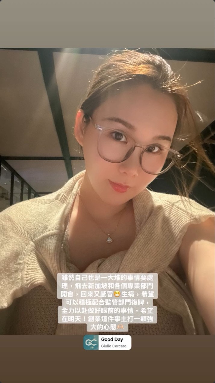 黃梓漫坦言:「心情由興奮到一覺夢醒來,再到各個媒體&博主的報導同分析(正面和負面的我都全然接受),反思和復盤,9年前由兩個人的公司做到現在將近50人的規模,疫情最艱難的時候把自己的嫁妝龍鳳手鐲都拿去當鋪抵押給員工出糧,創業路上也一直盡自己所能去做善事,每個創業者都不容易,並不是誰都理解你的艱辛,做生意很多時候都是九死一生。如果沒有東山再起的勇氣,就沒有絕處逢生的機會,沒有破繭成蝶的蛻變,也沒有真正掌握命運的可能。成功就是從失敗到失敗,而熱情不減。這份『熱情』的根基,正是東山再起的勇氣。」