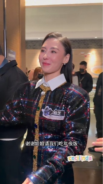 昨晚有網民於社交網分享了一段張栢芝以嘉賓身份應邀出席品牌活動的短片,以「2025年的尾巴,張栢芝請我們吃黑珍珠晚宴」為標題,發文寫道:「連品牌方都在說,沒有見過對粉絲這麽好的藝人,真的,我也沒見過,除了張栢芝 #張栢芝 #港星女神 #和偶像零距離 #明星和粉絲雙向奔赴的愛」,張栢芝真是超級寵粉。片中可見張栢芝一班粉絲在多謝她請食年夜飯,張栢芝表示她試了晚宴的美食很美味,所以想請粉絲吃,她就先回家照顧仔仔吃飯。張栢芝又摟住一名粉絲喊對方「我老公」,臨走前還特地坐下來跟大家合照,氹得粉絲好開心。而張栢芝的美貌更是震驚了一眾網民,指她狀態極好,不但不會老,甚至愈來愈靚,靚出新境界。