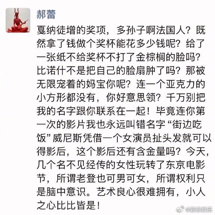 2025年11月初,郝蕾的朋友圈內容被網民曝光,直指「威尼斯憑藉女演員扯頭髮得影后,含金量存疑」,並批評康城影展臨時增設獎項、東京國際電影節評獎不公(因辛芷蕾憑《日掛中天》獲威尼斯影后,片中恰有「扯頭髮」鏡頭),被網民解讀為暗諷辛芷蕾。又因為該內容曝出時間臨近在辛芷蕾電影上映首日(11月7日),此舉引發了大規模爭議。