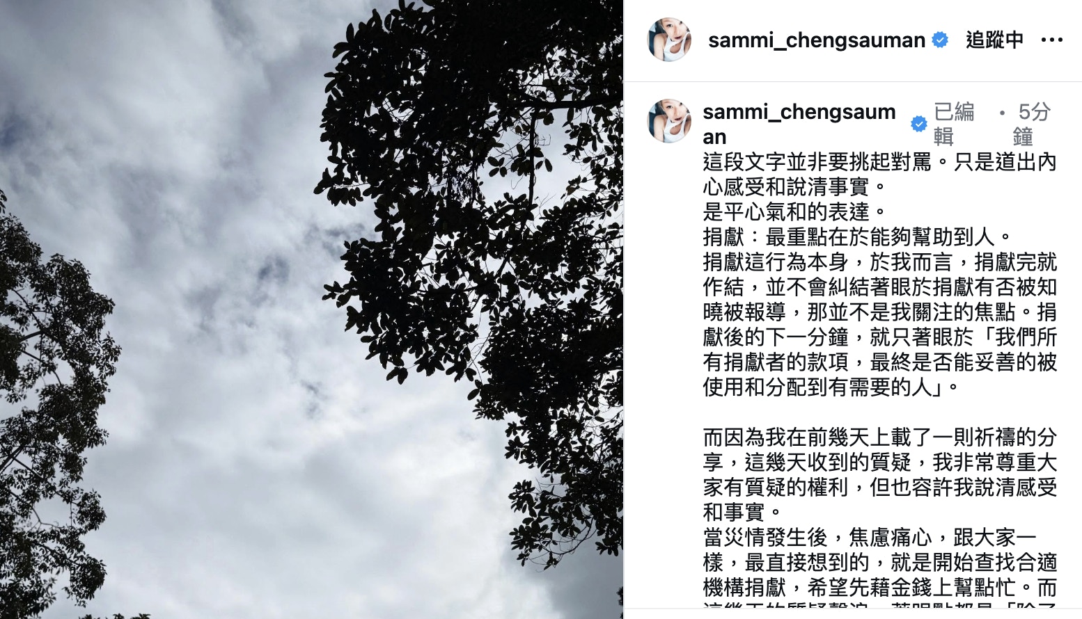 除了澄清捐款事實,鄭秀文更藉此機會為「祈禱」的力量發聲。她指出,「祈禱(代禱)從來在我心裡,是帶有力量,並非虛無的寄托,是對天父的托付以及對別人的愛」。她回憶,當時為了能趕上為災民代禱的祈禱會,她在拍攝早收半小時後便「飛車前往」,只因不想錯過這次在無助中能做的事。