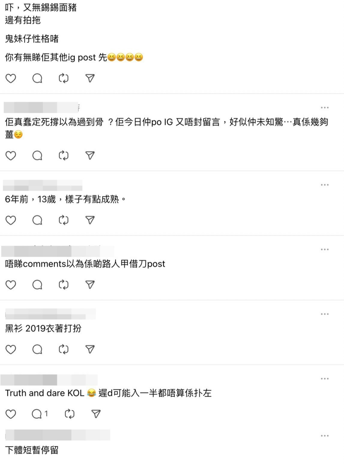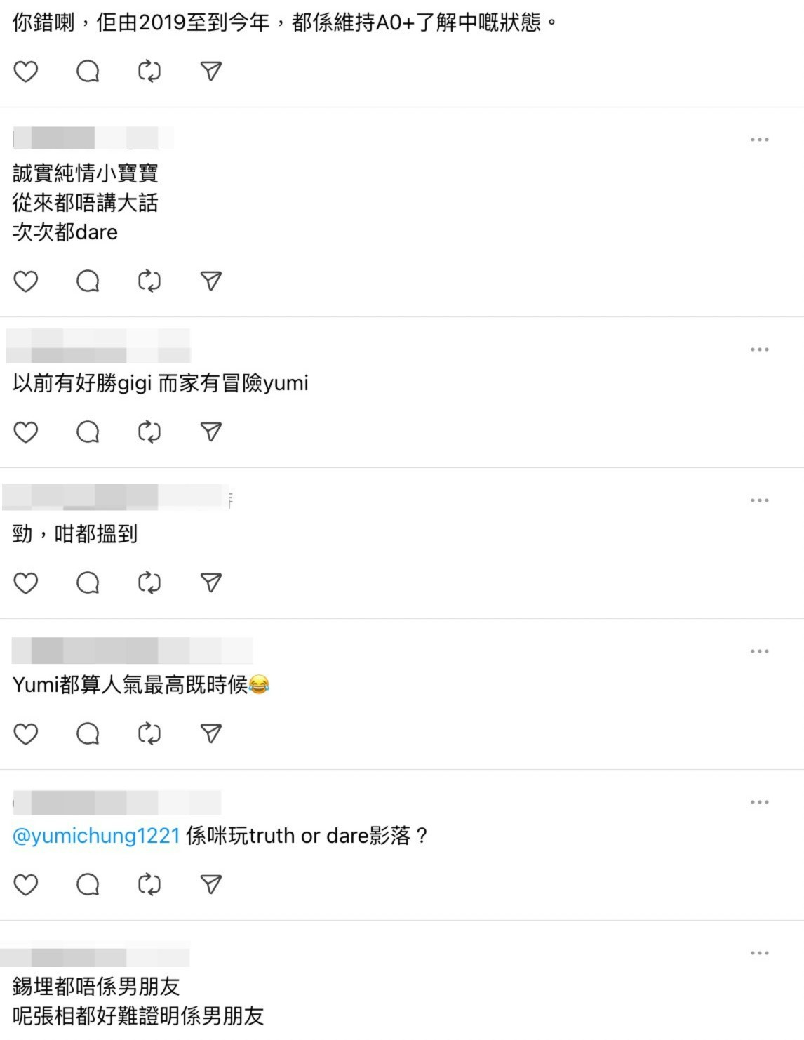 有大批網民看到照片後,都忍不住留言指鍾柔美擘大眼講大話,更不理解為何要扮A0:「又話自己A0」、「點解要扮A0」、「鍾柔美得罪全世界」、「佢由2019至到今年,都係維持A0+了解中嘅狀態。」、「錫埋都唔係男朋友?」、「咩呀 了解中呀」、「佢真蠢定死撐以為過到骨 ?佢今日仲po IG 又唔封留言,好似仲未知驚⋯真係幾夠薑😌」、「等睇解畫又有咩新奇答案」、「次次都dare, 幾時先可以true番次,講真話?」。