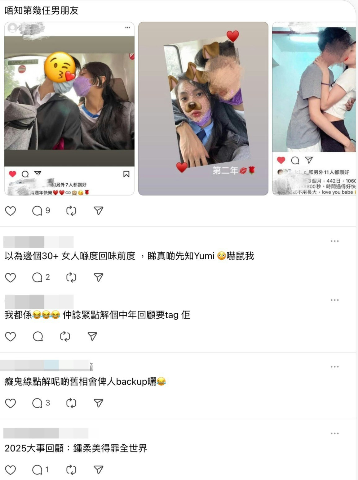 今日凌晨有網民在Threads公開鍾柔美與第一任男友的另一張合照,隨即掀起網民熱議。其後有網民在留言區分享更多鍾柔美與另一前男友的照片,在3張照片中兩人均穿上校服在車廂中甜蜜合照,更有一張兩人在後樓梯擁吻的照片。