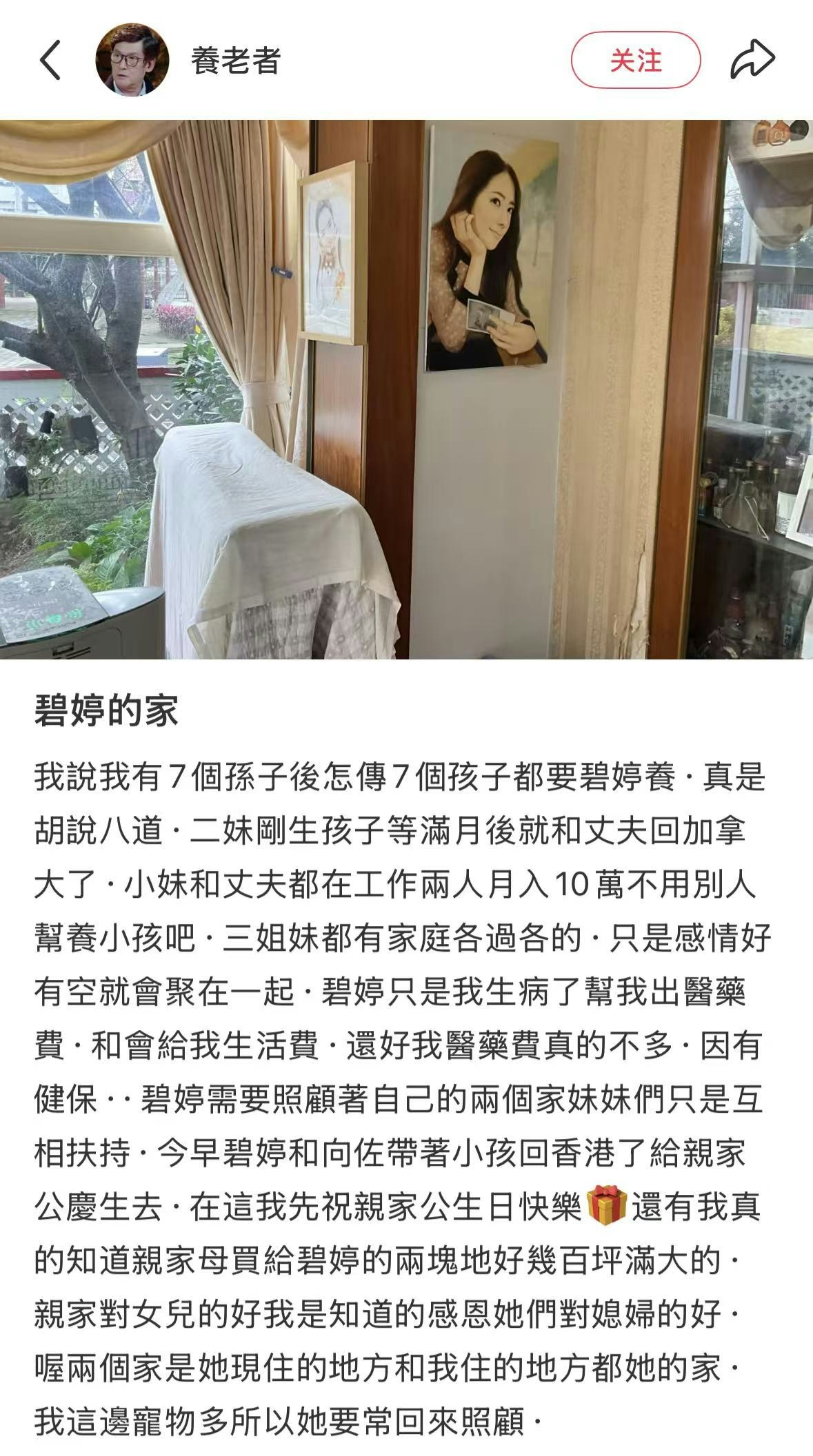 郭碧婷父親在社交媒體上闢謠外界對向家的揣測。(小紅書@養老者)