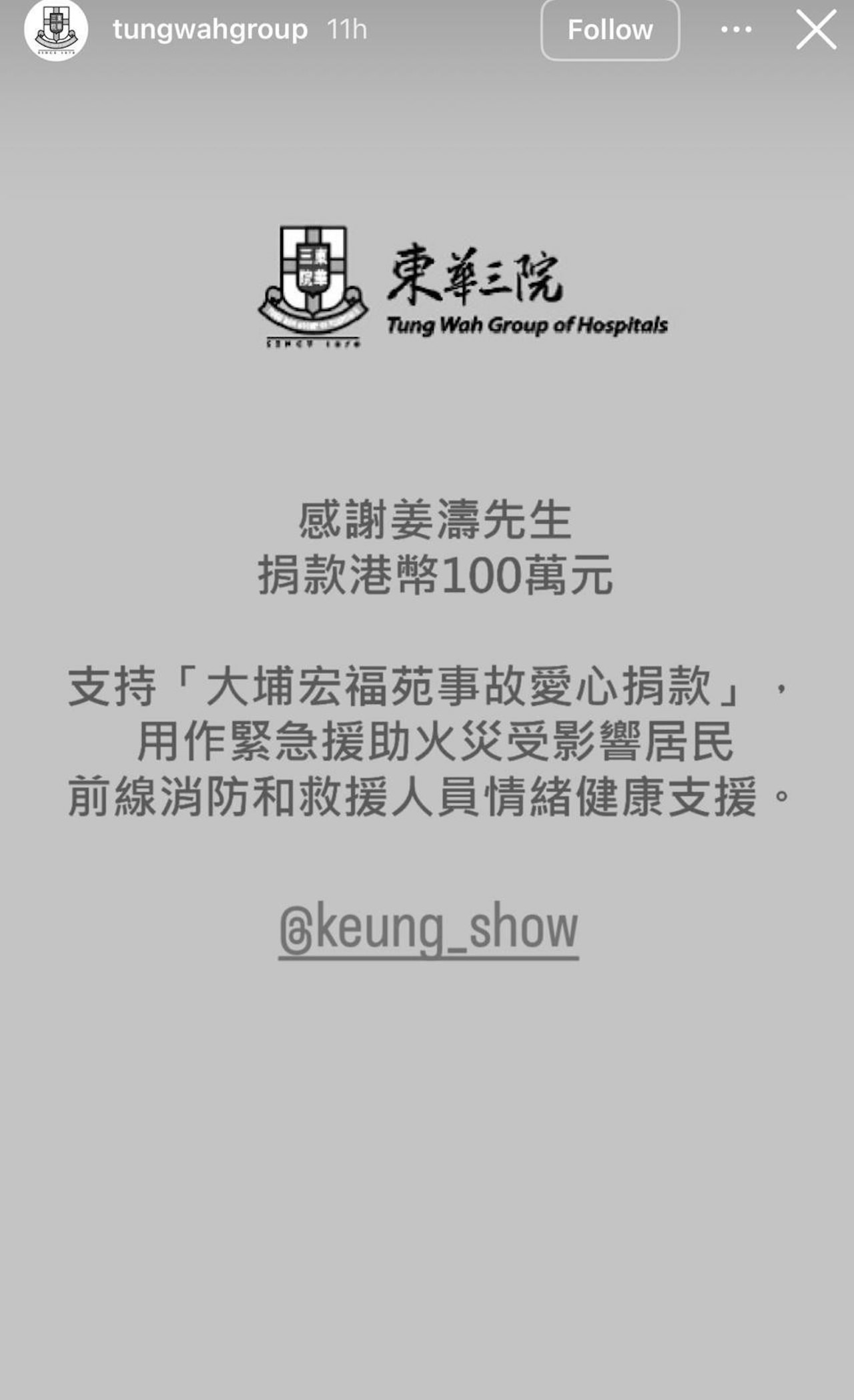 姜濤透過東華三院捐出100萬港元用作緊急援助大埔宏福苑事故災民,表明「用作緊急援助火災受影響居民,前線消防和救援人員情緒健康支援」。