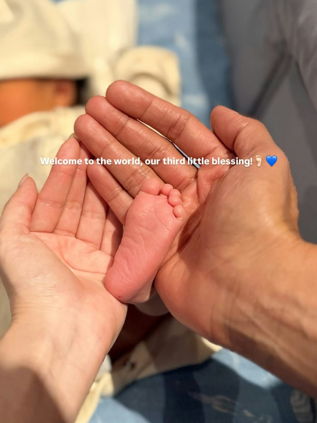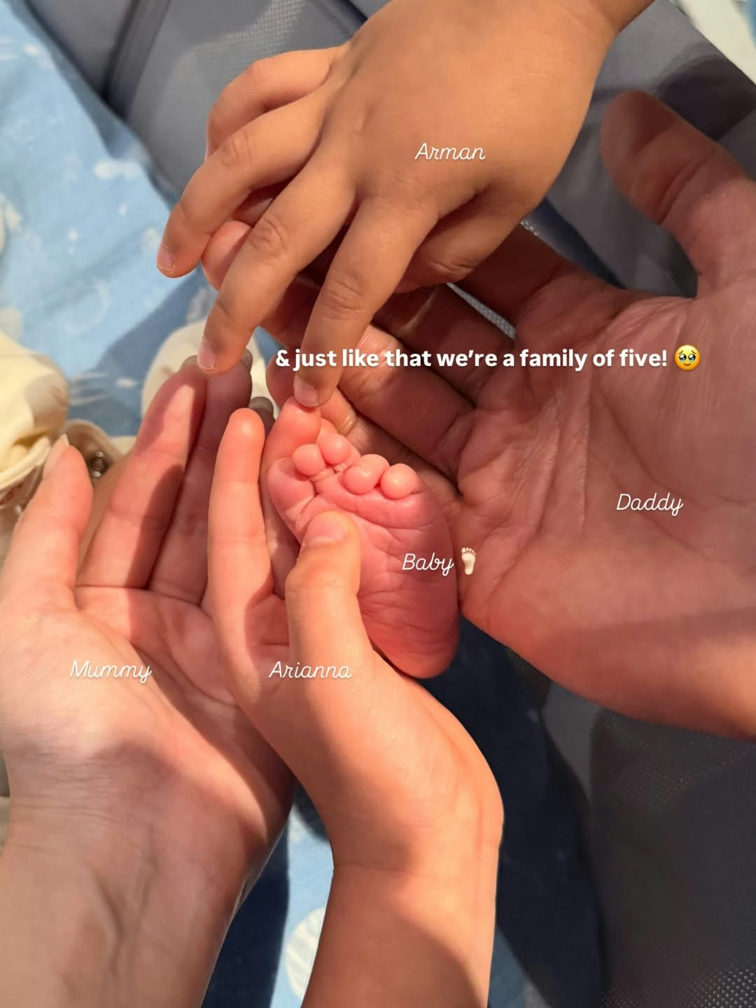 陳雪鈴昨晚在IG宣布喜訊,透露誕下第三胎,細仔已經出世。陳雪鈴分享多張溫馨的家庭照片,她與丈夫Faliq捧住BB仔的小腳,另一張就加上一對仔女,組成五口之家。今日凌晨,陳雪鈴在IG限時動態表示產後第三天,開心孕期已經結束。陳雪鈴以英文留言:「Arianna、Arman再加上你,我們珍貴的第三個寶寶出生感恩!」