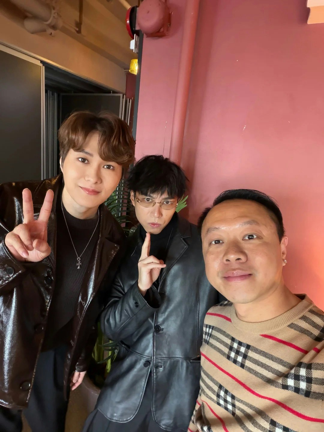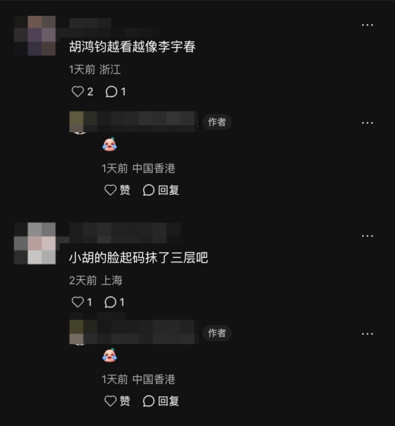 至於另一張合照中,胡鴻鈞與吳業坤則同樣以黑色皮褸造型現身。向來搞鬼的坤哥貫徹其一向作風,面對鏡頭擺出搞怪表情;相反,身旁的胡鴻鈞似乎「偶包」甚重,雖然配合地舉起V字手勢,但表情卻稍顯僵硬。這張照片隨即引來網民「點評」,大家焦點全集中在胡鴻鈞的妝容與面型上。有網民直言胡鴻鈞的妝感過濃,與旁邊自然的坤哥形成強烈對比:「小胡的臉起碼抹了三層吧」;甚至有人直指他:「胡鴻鈞越看越像李宇春」。