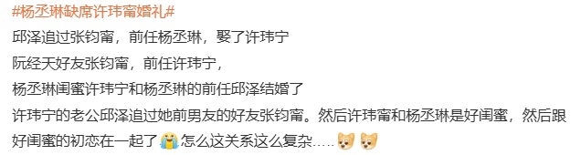 另外,有網民爆料表示:「邱澤曾追過張鈞甯,前任女友是楊丞琳,娶了許瑋甯;阮經天是張鈞甯的好友,前任是許瑋甯;楊丞琳的閨蜜許瑋甯和楊丞琳的初戀邱澤結婚了;許瑋甯的老公邱澤追過她前男友的好友張鈞甯,然後許瑋甯和楊丞琳是好閨蜜,然後跟好閨蜜的初戀在一起了。」部分網民猜測這樣一段複雜關係也是楊丞琳不願意出席婚禮的原因之一。