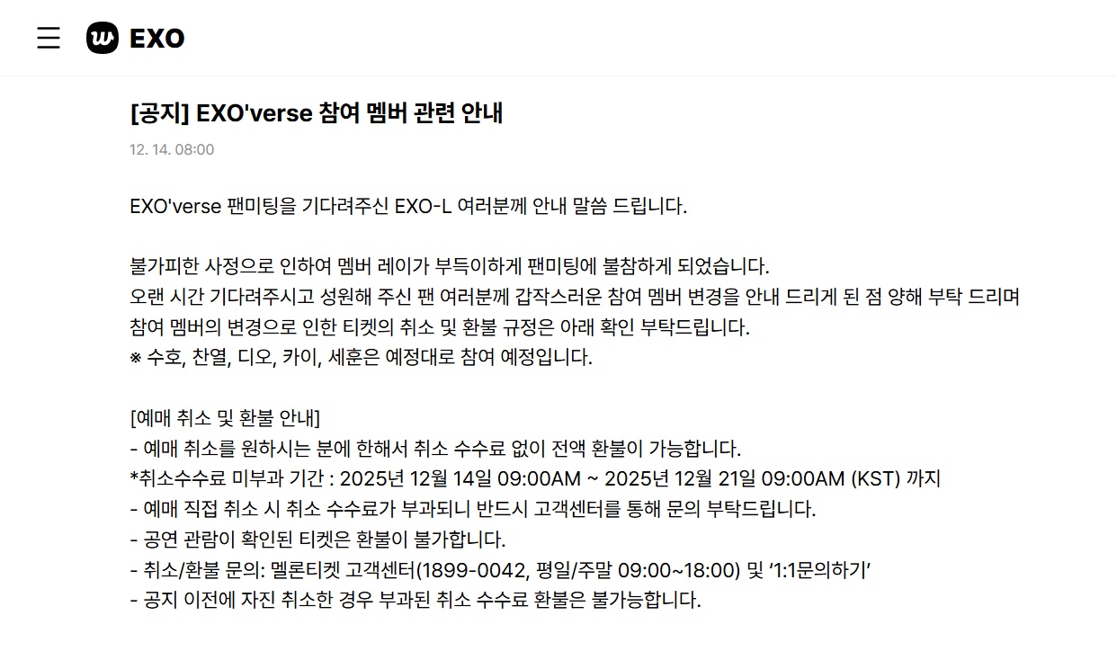 EXO原定於14日在仁川舉行兩場見面會,這也是團體時隔約一年半的公開活動,加上早前官方宣傳中明確包含久未歸隊的張藝興,令門票一早被秒殺。然而,SM娛樂在活動當日上午9時(當地時間)突然發表聲明,指「因不可抗力因素,成員Lay將無法參與本次見面會」,並開放粉絲退票。