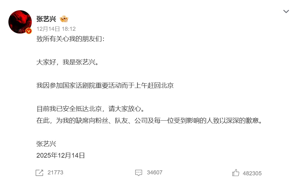 面對外界揣測,張藝興於當晚在微博發文親自解釋。他透露自己是因為要參加「國家話劇院的重要活動」,而在當日上午緊急趕回北京。他在文中寫道:「目前我已安全抵達北京,請大家放心。在此,為我的缺席向粉絲、隊友、公司以及每一位受到影響的人致以深深的歉意。」