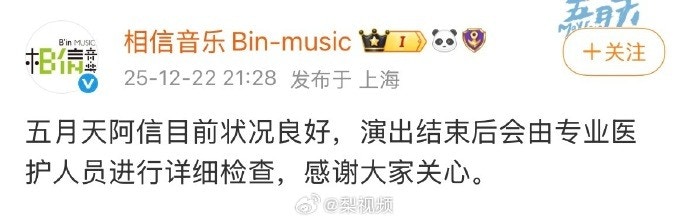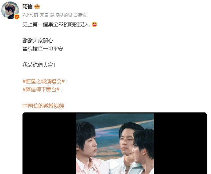 昨晚,阿信在演唱會完畢後,他所屬公司相信音樂Bin-music 就於微博發文報平安,表示:「五月天阿信目前狀況良好,演出結束後會由專業醫護人員進行詳細檢查,感謝大家關心。 」阿信亦有於他的個人帳號發文寫道:「史上第一個集全F3的吻的男人😆 謝謝大家關心 醫院檢查一切平安 我愛你們大家!」讓粉絲可以放心。