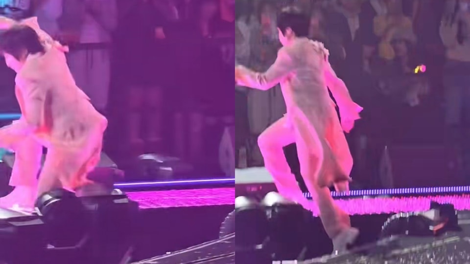演出期間阿信不慎叉錯腳從兩米高舞台墮下,導致雙手被擦傷,但他極速重返舞台繼續演出,更興奮地向三子熱情索吻。(小紅書圖片)